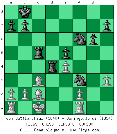 Last move : 0-1 2016 July 19 2:15:31 [Event "FICGS__CHESS__CLASS_C__000230"] [Site "FICGS"] [Date "2016.01.04"] [Round "1"] [White "von Buttlar,Paul"] [Black "Domingo,Jordi"] [Result "0-1"] [WhiteElo "1640"] [BlackElo "1854"] 1.c4 e6 2.Nc3 d5 3.d4 dxc4 4.e4 c5 5.Nf3 cxd4 6.Nxd4 e5 7.Nf3 Qxd1+ 8.Kxd1 Nc6 9.Bxc4 Bg4 10.Be3 f5 11.h3 O-O-O 12.Kc1 Bxf3 13.gxf3 f4 14.Bd2 Bc5 15.Rg1 g6 16.Rf1 Nd4 17.Nd5 Kb8 18.Bc3 Nxf3 19.Nxf4 Nf6 20.Ne6 Rc8 21.Nxc5 Rxc5 22.Bd3 Rd8 23.Bc2 Rd4 0-1 English Opening Queenside Castling by player Black (move 11) Player Black won this chess game. Follow this game move after move (download)The sign of a great Master is his ability to win a won game quickly and painlessly. (Irving Chernev) Modernes Schach erfordert enorme Anspannung. Es ist für einen normalen Menschen unmöglich das auszuhalten. (Viktor Kortschnoi) Me dio la sensación de como si yo estuviera jugando en contra del mismo Ajedrez. - al estar jugando en contra de Robert Fischer (Walter Shipman) En blitz, le Cavalier l'emporte sur le Fou. (Vlastimil Hort) My poor ole parrot... Is not in the circulation of displays ....poo hoo hoo :) (Wayne Lowrance's enigma)