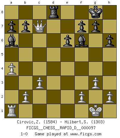 Last move : 1-0 2016 February 10 10:49:35 [Event "FICGS__CHESS__RAPID_D__000097"] [Site "FICGS"] [Date "2016.01.04"] [Round "1"] [White "Cirovic,Zeljko"] [Black "Hilbert,Stephan J."] [Result "1-0"] [WhiteElo "1584"] [BlackElo "1303"] 1.e4 d5 2.exd5 Qxd5 3.Nc3 Qa5 4.Nf3 Nf6 5.Bc4 Bf5 6.d3 e6 7.Bd2 c6 8.Nb5 cxb5 9.Bxa5 bxc4 10.dxc4 Nc6 11.Bc7 Be7 12.O-O O-O 13.Ne5 Nxe5 14.Bxe5 Rfd8 15.Qf3 Be4 16.Qg3 Bg6 17.Bxf6 Bxf6 18.c3 Bd3 19.Rfd1 Bxc4 20.Rxd8+ Rxd8 21.Qc7 Ba6 22.g3 h6 23.a4 1-0 Scandinavian (centre counter) defense Kingside Castling by player White (move 12) Kingside Castling by player Black (move 12) Player White won this chess game. Follow this game move after move (download)I'm not afraid of Spassky. The world knows I'm the best. You don't need a match to prove it. (Bobby Fischer) Ich weiss nicht was Gott gegen mich auf 1.e4 antworten würde. (Robert James Fischer) El Ajedrez es realmente noventa y nueve por ciento calculación. (Soltis) Le pion, dans sa simplicité, marche droit devant lui, mais lorsqu'il prend, il le fait obliquement? Ainsi l'homme, tant qu'il reste pauvre, marche dans la droiture et vit honnêtement, mais lorsqu'il recherche les honneurs, il flatte, se parjure et, par les voies obliques, cherche une position supérieure sur l'échiquier du monde. (Jean de Galles) God, you are such an idiot. - Actually, I thought I was more of a jerk. (Gregory House to Stacy Warner, House M.D.)