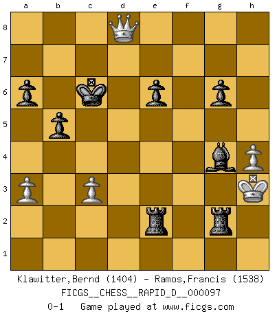Last move : 0-1 2016 March 8 13:2:22 [Event "FICGS__CHESS__RAPID_D__000097"] [Site "FICGS"] [Date "2016.01.04"] [Round "1"] [White "Klawitter,Bernd"] [Black "Ramos,Francis"] [Result "0-1"] [WhiteElo "1404"] [BlackElo "1538"] 1.e4 c5 2.Nf3 d6 3.d4 cxd4 4.Nxd4 Nf6 5.Nc3 a6 6.f3 e6 7.Be3 Be7 8.Be2 O-O 9.Nb3 Nc6 10.O-O b5 11.Kh1 Bb7 12.Qd2 Rc8 13.a3 Ne5 14.Bd3 Qc7 15.Nd4 Rfe8 16.Rac1 Nc4 17.Bxc4 Qxc4 18.Nce2 Bf8 19.c3 Nd7 20.Nc2 Ne5 21.Nf4 Red8 22.Bd4 Qc7 23.Qf2 Nc4 24.Nd3 Qe7 25.Be3 Qf6 26.Nf4 Nxe3 27.Qxe3 Rc5 28.Nd3 Rc4 29.Nd4 Rdc8 30.Nf2 h5 31.Ne2 g6 32.Rcd1 Kh7 33.Qd3 d5 34.exd5 Bxd5 35.Qb1 Bh6 36.Ne4 Qe7 37.Nd2 R4c5 38.Ne4 R5c7 39.f4 Rc4 40.Ng5+ Bxg5 41.fxg5 Rg4 42.Nf4 Bb3 43.Nxh5 Rxg5 44.Nf6+ Kg7 45.Rd7 Qf8 46.Nh7 Kxh7 47.R1xf7+ Kg8 48.Rxf8+ Rxf8 49.h4 Rg4 50.Kh2 Rf2 51.Qg1 Rxb2 52.Rd8+ Kg7 53.Qa7+ Kf6 54.Rf8+ Ke5 55.Qe3+ Kd6 56.Qb6+ Ke5 57.Qe3+ Kd6 58.Qd3+ Bd5 59.Kh3 R4xg2 60.Rf3 Kc6 61.Qe3 Rbe2 62.Qd3 Be4 63.Qd4 Bxf3 64.Qd8 Bg4+ 0-1 Sicilian : Najdorf Kingside Castling by player Black (move 8) Kingside Castling by player White (move 10) Player Black won this chess game. Follow this game move after move (download)I have always a slight feeling of pity for the man who has no knowledge of Chess. (Siegbert Tarrasch) Herr Iljumschinow ist ein etwas merkwürdiger Geschäftsmann: Er arbeitet zusammen mit Leuten wie Muammar al-Gaddafi; früher ist das Saddam Hussein gewesen. (Joel Lautier) Entre mas años cumplo, mas valoro los Peones. (Keres) Psychologiquement, tu dois avoir confiance en toi même, mais cette confiance doit être basée sur des faits. (Robert Fischer) Only sick music makes money today. (Friedrich Nietzsche)