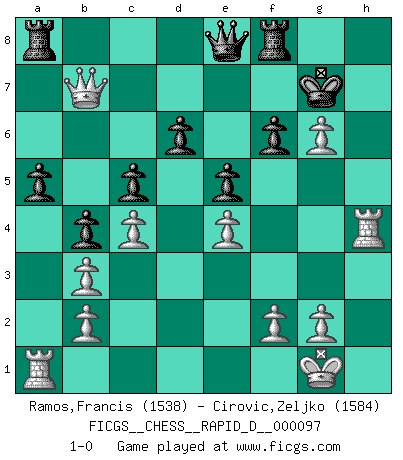 Last move : 1-0 2016 February 16 19:21:23 [Event "FICGS__CHESS__RAPID_D__000097"] [Site "FICGS"] [Date "2016.01.04"] [Round "1"] [White "Ramos,Francis"] [Black "Cirovic,Zeljko"] [Result "1-0"] [WhiteElo "1538"] [BlackElo "1584"] 1.e4 e5 2.Nf3 Nc6 3.Bb5 a6 4.Ba4 Nf6 5.O-O b5 6.Bb3 Be7 7.Re1 d6 8.h3 Na5 9.c3 Nxb3 10.axb3 c5 11.d3 Be6 12.Nbd2 O-O 13.c4 b4 14.Nf1 Nd7 15.Ne3 Nf6 16.Nf5 Bxf5 17.exf5 a5 18.Ng5 h6 19.Ne4 Nxe4 20.dxe4 Bg5 21.Bxg5 hxg5 22.Re3 f6 23.Qd5+ Kh7 24.h4 gxh4 25.Rh3 g5 26.fxg6+ Kg7 27.Rxh4 Qe8 28.Qb7+ 1-0 Ruy Lopez : 5.O-O Kingside Castling by player White (move 5) Kingside Castling by player Black (move 12) Player White won this chess game. Follow this game move after move (download)In Fischer's hands, a slight theoretical advantage is as good a being a Queen ahead. (Isaac Kashdan) Irgendwie scheint mir sonntags früh um 9 Uhr der Killerinstinkt verloren gegangen zu sein. (Alexej Shirov) Cuando tengo las piezas blancas, yo gano porque soy blanco; Cuando tengo las piezas negras, yo gano porque soy Bogolyubov. (Bogolyubov) Même si l'adversaire joue le coup analysé précédemment, recommencez l'analyse en voyant la nouvelle position. Première règle de Blumenfeld Quotation,n.: The act of repeating erroneously the words of another. The words erroneously repeated. (Ambrose Bierce, The Devil's Dictionary)