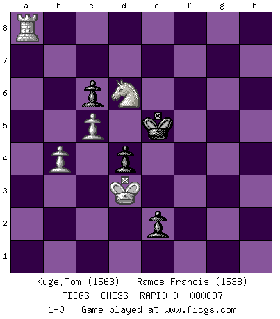 Last move : 1-0 2016 February 1 16:12:30 [Event "FICGS__CHESS__RAPID_D__000097"] [Site "FICGS"] [Date "2016.01.04"] [Round "1"] [White "Kuge,Tom"] [Black "Ramos,Francis"] [Result "1-0"] [WhiteElo "1563"] [BlackElo "1538"] 1.c4 Nf6 2.Nc3 g6 3.e4 d6 4.d4 Bg7 5.Be2 O-O 6.g4 e5 7.d5 a5 8.h4 Na6 9.g5 Ne8 10.Be3 f5 11.exf5 gxf5 12.f4 exf4 13.Bd4 Be5 14.Nf3 Qe7 15.Qd2 Ng7 16.h5 Bxd4 17.Qxd4 Qe3 18.h6 Qxd4 19.Nxd4 Ne8 20.O-O-O Nc5 21.Bf3 Bd7 22.Rh2 Rc8 23.Re2 c6 24.dxc6 bxc6 25.Re7 Rf7 26.Rxf7 Kxf7 27.Bh5+ Kf8 28.Nde2 Be6 29.b3 a4 30.Kc2 axb3+ 31.axb3 Ne4 32.Nxe4 fxe4 33.Nxf4 Bf5 34.Kc3 Ke7 35.Bxe8 Rxe8 36.Ra1 e3 37.Ra7+ Bd7 38.g6 hxg6 39.h7 Kd8 40.Nxg6 e2 41.Ra1 Bf5 42.h8Q Rxh8 43.Nxh8 Ke7 44.Kd2 Kf6 45.Ra7 Bd3 46.Nf7 d5 47.Nd6 Ke6 48.c5 d4 49.b4 Kd5 50.Ra8 Ke5 51.Kxd3 1-0 English Opening Kingside Castling by player Black (move 5) Queenside Castling by player White (move 20) Promotion Queen by player White (move 42) 10 pieces endgame at move 43 : White KRNPP , Black KBPPP WHITE : King + 1 Rook 1 Knight 2 Pawns BLACK : King + 1 Bishop 3 Pawns 9 pieces endgame at move 51 : White KRNPP , Black KPPP WHITE : King + 1 Rook 1 Knight 2 Pawns BLACK : King + 3 Pawns Player White won this chess game. Follow this game move after move (download)Methodical thinking is of more use in Chess than inspiration. (C. J. S. Purdy) Ein Schachspiel besteht aus drei Phasen: Die erste, wenn du hofftst den Vorteil zu haben, die zweite, wenn du glaubst einen Vorteil zu haben, und die dritte.... wenn du weißt Du wirst verlieren. (Savielly Grigorievitsch Tartakower) El Ajedrez se juega con la mente... ¡no con las manos!. (Renaud y Kahn) Je fais ceci parce que dans cinquante coups j'obtiendrai cela; je m'appelle Mikhail Moisevitch Botvinnik. (Botvinnik) Plans are ideas that never come to fruition. (Daniel Parmet)