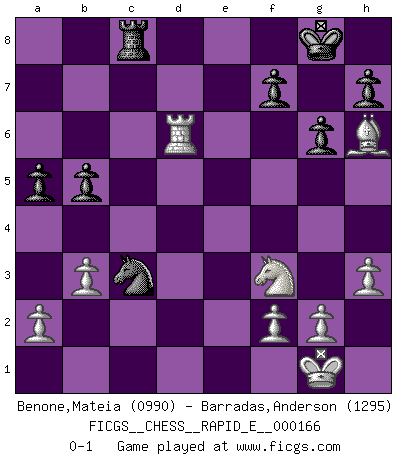 Last move : 0-1 2016 March 5 5:39:5 [Event "FICGS__CHESS__RAPID_E__000166"] [Site "FICGS"] [Date "2016.01.05"] [Round "1"] [White "Benone,Mateia"] [Black "Barradas,Anderson"] [Result "0-1"] [WhiteElo "0990"] [BlackElo "1295"] 1.Nf3 Nf6 2.c4 e6 3.d4 Bb4+ 4.Bd2 Be7 5.Nc3 b6 6.e4 Bb7 7.e5 Ng4 8.h3 Nh6 9.Bd3 Nf5 10.Bxf5 exf5 11.O-O O-O 12.d5 d6 13.exd6 cxd6 14.Rc1 Nd7 15.Qc2 g6 16.Bh6 Re8 17.Nb5 a6 18.Nbd4 Rc8 19.Nxf5 b5 20.b3 Bxd5 21.Nxe7+ Qxe7 22.Qb2 Qf6 23.Qxf6 Nxf6 24.cxd5 Nxd5 25.Rxc8 Rxc8 26.Rd1 Nc3 27.Rxd6 a5 0-1 This chess game has been lost on time (started : 2016.01.05 1:4:59) Reti Opening Kingside Castling by player White (move 11) Kingside Castling by player Black (move 11) Player Black won this chess game. Follow this game move after move (download)The passion for playing Chess is one of the most unaccountable in the world. (H.G. Wells) Mein erstes Ziel war nicht, die Partie zu gewinnen, sondern eine Figur zu opfern. -- der junge (Wilhelm Steinitz) Bobby Fischer es el jugador de Ajedrez mas grande que jamás haya existido. (Ken Smith) La conception d'un plan est le processus par lequel un joueur exploite les avantages de sa position tout en s'efforçant d'en réduire au minimum les inconvénients. Afin de garantir le succès, un plan doit toujours se fonder sur un diagnostic objectif des particularités d'une position. La conception d'un plan est d'autant plus difficile que la position est équilibrée, et grandement facilitée lorsqu'il n'existe qu'un seul plan susceptible de répondre aux exigences de la position. (Harry Golombek) Creativity is inventing, experimenting, growing, taking risks, breaking rules, making mistakes, and having fun. (Mary Lou Cook)