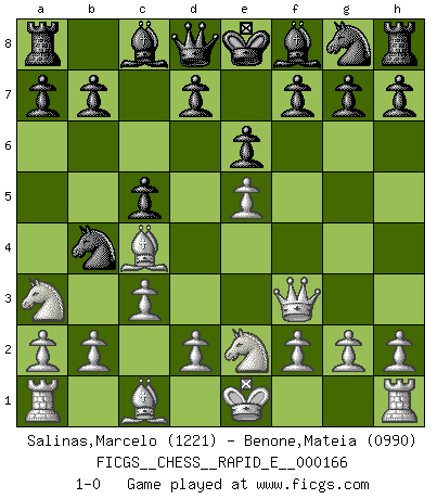 Last move : 1-0 2016 February 19 14:0:44 [Event "FICGS__CHESS__RAPID_E__000166"] [Site "FICGS"] [Date "2016.01.05"] [Round "1"] [White "Salinas,Marcelo"] [Black "Benone,Mateia"] [Result "1-0"] [WhiteElo "1221"] [BlackElo "0990"] 1.e4 c5 2.Bc4 Nc6 3.Qf3 Nf6 4.Ne2 Nb4 5.Na3 e6 6.e5 Ng8 7.c3 1-0 Sicilian defense Player White won this chess game. Follow this game move after move (download)Bobby Fischer's current state of mind is indeed a tragedy. One of the world's greatest Chess players - the pride and sorrow of American Chess. (Frank Brady) Im Hotelzimmer gab es nur zwei Schaben. (Über die Turnierbedingungen) (Peter Swidler) Entre mas años cumplo, mas valoro los Peones. (Keres) Les Echecs sont affaire de jugement sensible. Savoir quand frapper et quand esquiver. (Fischer) Drag your thoughts away from your troubles... by the ears, by the heels, or any other way you can manage it. (Mark Twain)
