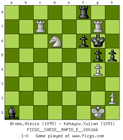 Last move : 1-0 2016 May 26 6:17:16 [Event "FICGS__CHESS__RAPID_E__000166"] [Site "FICGS"] [Date "2016.01.05"] [Round "1"] [White "Bromo,Alexis"] [Black "Kehayov,Yulian"] [Result "1-0"] [WhiteElo "1095"] [BlackElo "1091"] 1.d4 d5 2.c4 c5 3.Nc3 cxd4 4.Qxd4 e6 5.Nf3 Nc6 6.Qd1 Nf6 7.a3 Be7 8.e3 O-O 9.Be2 dxc4 10.Bxc4 Qxd1+ 11.Nxd1 Na5 12.Ba2 b6 13.O-O Bb7 14.Re1 Bd5 15.Bxd5 Nxd5 16.e4 Nf6 17.b4 Nb3 18.Rb1 Nxc1 19.Rxc1 a5 20.bxa5 Rxa5 21.Re3 b5 22.Nd4 b4 23.axb4 Bxb4 24.Nc6 h6 25.Nxa5 Bxa5 26.Ra3 Bb4 27.Ra4 Bd2 28.Rc2 Nxe4 29.Rxe4 Bg5 30.f4 Bf6 31.Ne3 Ba1 32.f5 exf5 33.Nxf5 Kh7 34.Rc7 Kg6 35.Nh4+ Kh7 36.g4 g5 37.Nf5 Kg6 38.Nd6 f6 39.R4e7 h5 40.Rg7+ 1-0 QGD : Symmetrical (Austrian) defense Kingside Castling by player Black (move 8) Kingside Castling by player White (move 13) Player White won this chess game. Follow this game move after move (download)Chess, like any creative activity, can exist only through the combined efforts of those who have creative talent, and those who have the ability to organize their creative work. (Mikhail Botvinnik) Frage des Reporters: -Welche besonderen Umstände rechtfertigen das Anhalten der Uhren während einer Turnierpartie? Antwort: -Einen Fotographen zu strangulieren. (Siegbert Tarrasch) Cuando tengo las piezas blancas, yo gano porque soy blanco; Cuando tengo las piezas negras, yo gano porque soy Bogolyubov. (Bogolyubov) Les échecs, c'est la lutte contre l'erreur. (Johannes Zukertort) The Movers & Shakers of this world are those who play chess in the mornings and go to the disco in the evenings. (Dinesh De Silva)