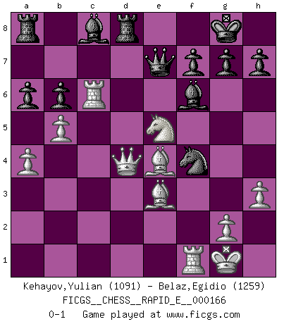 Last move : 0-1 2016 March 14 18:25:10 [Event "FICGS__CHESS__RAPID_E__000166"] [Site "FICGS"] [Date "2016.01.05"] [Round "1"] [White "Kehayov,Yulian"] [Black "Belaz,Egidio"] [Result "0-1"] [WhiteElo "1091"] [BlackElo "1259"] 1.e4 c5 2.d4 e6 3.Nf3 Nf6 4.Bd3 Nc6 5.c3 Qa5 6.dxc5 Qxc5 7.O-O Be7 8.h3 d6 9.b4 Qb6 10.Be3 Qc7 11.Na3 e5 12.b5 Na5 13.Rb1 Qxc3 14.Bc1 Qc7 15.Be3 O-O 16.Rc1 Qd7 17.Qa4 b6 18.Nc4 Nxc4 19.Qxc4 a6 20.a4 d5 21.exd5 Nxd5 22.Nxe5 Qe6 23.Qd4 Bf6 24.f4 Rd8 25.Rc6 Qe7 26.Be4 Nxf4 0-1 This chess game has been lost on time (started : 2016.01.05 1:4:59) Sicilian : Smith-Morra gambit Kingside Castling by player White (move 7) Kingside Castling by player Black (move 15) Player Black won this chess game. Follow this game move after move (download)I have never in my life played the French Defence, which is the dullest of all openings. (Wilhelm Steinitz) Vom Schach wurde gesagt das Leben sei dafür nicht lange genug. Aber das ist der Fehler des Lebens, nicht des Schach'. (Irving Chernev) Los Peones son nacidos libres, y aún así, se encuentran encadenados por todos lados. (Rick Kennedy) A chaque perte on perd un peu de soi. (Joël Lautier) They misunderestimated me. (George W. Bush, Bentonville nov. 6, 2000)