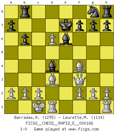 Last move : 1-0 2016 January 12 23:13:15 [Event "FICGS__CHESS__RAPID_E__000166"] [Site "FICGS"] [Date "2016.01.05"] [Round "1"] [White "Barradas,Anderson"] [Black "Leurette,Marc-Antoine"] [Result "1-0"] [WhiteElo "1295"] [BlackElo "1114"] 1.e4 e5 2.Nf3 Nc6 3.d4 exd4 4.Nxd4 Bc5 5.Nxc6 Qf6 6.Qf3 Qxc6 7.Bd3 Qf6 8.Bf4 d6 9.Nc3 Bd4 10.Nd5 Qe6 11.Nxc7+ Ke7 12.Nxe6 Bxe6 13.O-O-O b6 14.e5 Rb8 15.exd6+ 1-0 Scotch game Queenside Castling by player White (move 13) Player White won this chess game. Follow this game move after move (download)Daring ideas are like Chess men moved forward. They may be beaten, but they may start a winning game. (Johann Wolfgang von Goethe) Die Fehler sind da, Sie warten nur darauf gemacht zu werden. (Savielly Grigorievitsch Tartakower) La vida es como un juego de Ajedrez, cambiando con cada movimiento. (Proverbio Chino) Je ne suis pas le dernier à jouer lâchement des coups douteux pendant le zeïtnot de l'adversaire pour l'achever: en effet les coups qui font le plus peur sont ceux que l'on ne comprend pas. Je me fais souvent peur quand je joue. (Un professeur anonyme) Chess is everything: art, science and sport. (Anatoly Karpov)