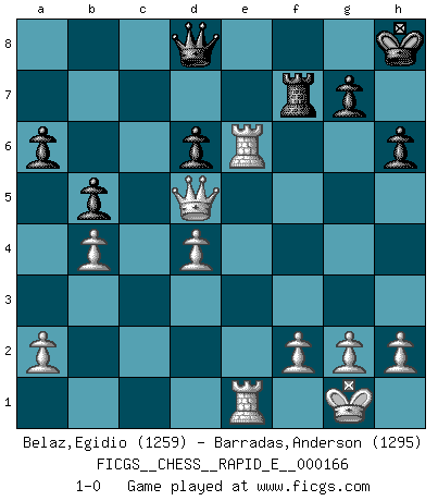 Last move : 1-0 2016 January 31 16:16:7 [Event "FICGS__CHESS__RAPID_E__000166"] [Site "FICGS"] [Date "2016.01.05"] [Round "1"] [White "Belaz,Egidio"] [Black "Barradas,Anderson"] [Result "1-0"] [WhiteElo "1259"] [BlackElo "1295"] 1.d4 d5 2.Nf3 Nc6 3.e3 a6 4.Nc3 e6 5.Bd3 h6 6.O-O Bd6 7.e4 Bb4 8.exd5 exd5 9.Bd2 Bg4 10.Re1+ Nge7 11.Be2 O-O 12.Na4 Bxf3 13.Bxf3 Nf5 14.c3 Be7 15.Bg4 Nd6 16.Bf3 Nf5 17.Bg4 Nd6 18.Bf3 Nc8 19.b4 b5 20.Nb2 Re8 21.Nd3 Nb6 22.Bh5 Nd7 23.Nf4 Nf6 24.Ne6 fxe6 25.Bxe8 Nxe8 26.Qg4 Nf6 27.Qxe6+ Kh8 28.Qxc6 Ne4 29.Bf4 Bd6 30.Bxd6 cxd6 31.Qxd5 Nxc3 32.Qf7 Nd5 33.Qxd5 Ra7 34.Re6 Rf7 35.Rae1 1-0 Queen's pawn game, Chigorin variation Kingside Castling by player White (move 6) Kingside Castling by player Black (move 11) Player White won this chess game. Follow this game move after move (download)You know you're going to lose. Even when I was ahead I knew I was going to lose. - On playing against Fischer. (Andrew Soltis) Privat ist Kortschnoi kein schlechter Mensch, sehr sympathisch. Aber während des Spiels ist er grausam. Er will dich töten. (Miguel Najdorf) Una victoria por una combinación errónea, aunque sea espectacular, me llena de horror artístico. (Wilhelm Steinitz) Comme les marins qui ont mille raisons différentes d'aller en mer, les joueurs d'échecs en ont tout autant avant de s'installer devant une table et jouer... (Vincent Bertignac, philosophe) The man who strikes first admits that his ideas have given out. (Chinese proverb)