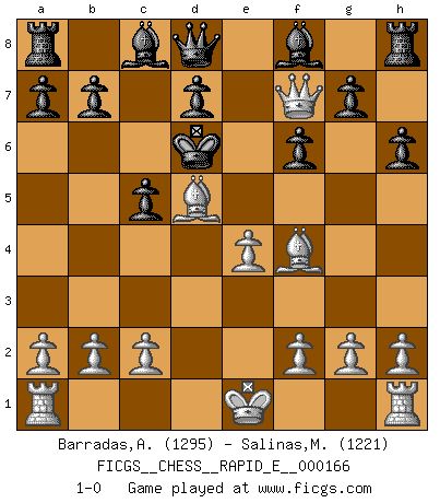 Last move : 1-0 2016 February 18 3:38:1 [Event "FICGS__CHESS__RAPID_E__000166"] [Site "FICGS"] [Date "2016.01.05"] [Round "1"] [White "Barradas,Anderson"] [Black "Salinas,Marcelo"] [Result "1-0"] [WhiteElo "1295"] [BlackElo "1221"] 1.e4 e5 2.Nf3 Nc6 3.d4 exd4 4.Nxd4 Nxd4 5.Qxd4 h6 6.Nc3 c5 7.Qd1 Qb6 8.Nd5 Qa5+ 9.Bd2 Qd8 10.Bc4 Nf6 11.Qf3 Nxd5 12.Bxd5 f6 13.Qh5+ Ke7 14.Qf7+ Kd6 15.Bf4+ 1-0 This chess game has been lost on time (started : 2016.01.05 1:4:59) Scotch game Player White won this chess game. Follow this game move after move (download)Chess opens and enriches your mind. (Saudin Robovic) Der Verteidiger gebe der Gewalt nach, aber nur der Gewalt. Er schaffe sich nicht freiwillig, etwa aus Blindheit oder aus Schrecken, irgendwelche Schwächen. Er lasse sich nicht bluffen. (Emanuel Lasker) El juego del Ajedrez no es solamente una diversión quieta; algunas cualidades muy valuables de la mente se pueden adquirir y cultivar con el, como convertirlos en habitos disponibles para toda ocasión; ya que la vida es algo así como el Ajedrez. (Benjamin Franklin) Horreur, mais aussi harmonie suprême : qu'y avait-il en effet au monde en dehors des échecs ? Le brouillard, l'inconnu, le non-être... (Vladimir Nabokov) A good player is always lucky. (Capablanca)