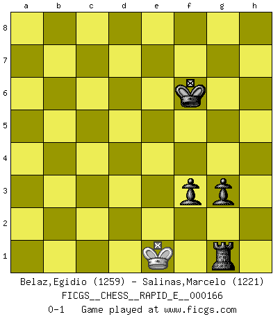 Last move : 0-1 2016 July 6 8:4:18 [Event "FICGS__CHESS__RAPID_E__000166"] [Site "FICGS"] [Date "2016.01.05"] [Round "1"] [White "Belaz,Egidio"] [Black "Salinas,Marcelo"] [Result "0-1"] [WhiteElo "1259"] [BlackElo "1221"] 1.d4 e6 2.Nf3 Qf6 3.Bg5 Qg6 4.Qd2 f6 5.Bh4 Nc6 6.c3 Nh6 7.Bg3 Bd6 8.Bxd6 cxd6 9.Nh4 Qh5 10.g3 e5 11.Bg2 g5 12.Bf3 Qf7 13.Ng2 exd4 14.cxd4 d5 15.O-O O-O 16.Nc3 Ne7 17.e4 d6 18.exd5 Bh3 19.Rfe1 Bxg2 20.Bxg2 Nhf5 21.Bh3 Qh5 22.Bxf5 Nxf5 23.Qd3 g4 24.Ne4 a6 25.b4 b5 26.a4 Rab8 27.axb5 Rxb5 28.Rab1 Rxd5 29.Qxa6 Nxd4 30.Nd2 Nc2 31.Qc6 Nxe1 32.Rxe1 Rxd2 33.b5 Qc5 34.Qxc5 dxc5 35.b6 Rb2 36.Re6 Kf7 37.Rc6 Kg6 38.Kg2 h5 39.Rxc5 Rxb6 40.Rc4 Rb1 41.h3 f5 42.hxg4 hxg4 43.Rc6+ Kh5 44.Rc7 Kg6 45.Rc6+ Rf6 46.Rxf6+ Kxf6 47.f3 Rb2+ 48.Kg1 Rb1+ 49.Kf2 Rb2+ 50.Ke3 Rb3+ 51.Kf2 Rxf3+ 52.Ke2 Rxg3 53.Kf2 f4 54.Kf1 f3 55.Kf2 Rg2+ 56.Kf1 g3 57.Ke1 Rg1+ 0-1 Queen's pawn Kingside Castling by player White (move 15) Kingside Castling by player Black (move 15) 10 pieces endgame at move 42 : White KRPPP , Black KRRPP WHITE : King + 1 Rook 3 Pawns BLACK : King + 2 Rooks 2 Pawns 9 pieces endgame at move 42 : White KRPP , Black KRRPP WHITE : King + 1 Rook 2 Pawns BLACK : King + 2 Rooks 2 Pawns 8 pieces endgame at move 46 : White KRPP , Black KRPP WHITE : King + 1 Rook 2 Pawns BLACK : King + 1 Rook 2 Pawns 7 pieces endgame at move 46 : White KPP , Black KRPP WHITE : King + 2 Pawns BLACK : King + 1 Rook 2 Pawns 6 pieces endgame at move 51 : White KP , Black KRPP WHITE : King + 1 Pawn BLACK : King + 1 Rook 2 Pawns 5 pieces endgame at move 52 : White K , Black KRPP WHITE : King + BLACK : King + 1 Rook 2 Pawns Player Black won this chess game. Follow this game move after move (download)Good offense and good defense both begin with good development. (Bruce A. Moon) Obendrein hat der FIDE-Präsident den Revolutionsführer Gaddafi zum »Großmeister« ernannt, am Ende der WM. Das ist lächerlich! (Joel Lautier) Dios mío, Bobby Fischer juega tan simple. (Alexei Suetin) Une platitude souvent récitée à propos des Echecs est qu'une des choses les plus difficiles à réaliser est de gagner une position gagnante. Cela ne manque pas de sens mais, pour ma part, j'ai toujours trouvé plus difficile de gagner une position perdante. (Tim Krabbe) There's always a bigger fish. (Qui-Gon Jinn in Star Wars ep.1)