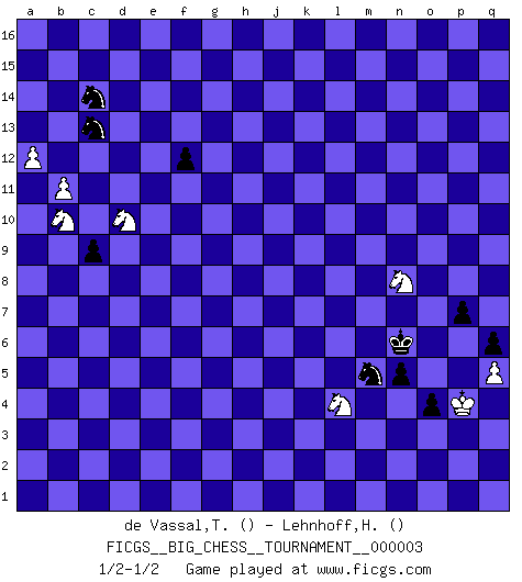 Last move : 1/2-1/2 2008 July 28 23:27:40 [Event "FICGS__BIG_CHESS__TOURNAMENT__000003"] [Site "FICGS"] [Date "2007.03.20"] [Round "1"] [White "de Vassal,Thibault"] [Black "Lehnhoff,Heinz-Georg"] [Result "1/2-1/2"] [WhiteElo ""] [BlackElo ""] 1.c2-c4 j15-h13 2.p1-o3 m15-m13 3.k1-l3 n15-n13 4.d2-d4 p16-o14 5.e2-e4 e15-e13 6.f2-f4 d15-d13 7.g2-g4 b16-c14 8.g1-f3 f16-b12 9.m2-m3 o16-f8 10.h2-j4 m16-m14 11.f3-h4 h16-m12 12.d4-d5 c16-n6 13.l1-n3 m14-k14 14.o3-m4 n6-q9 15.m4-k5 l16-q11 16.h1-f3 e16-e14 17.c1-d2 e14-f14 18.d2-c3 f8-g7 19.c3-g7 b12-g7 20.b1-c3 f14-f4 21.f3-e3 g7-e5 22.j1-k1 f4-f14 23.f1-e2 a16-e16 24.e1-f1 e16-e14 25.j2-g1 k14-k9 26.f1-f5 f14-f5 27.g4-f5 e14-g14 28.g1-f3 e5-h8 29.n3-h8 m12-h8 30.n2-n3 q15-q14 31.k1-l1 k9-o9 32.l3-n4 m13-m12 33.e3-b6 h8-b14 34.b6-b14 a15-b14 35.f3-g5 q16-m16 36.l1-m2 m16-m13 37.o1-n2 q9-n6 38.n2-o3 e13-e12 39.n4-l5 n6-j10 40.o3-l6 o9-o2 41.m2-n1 o2-l2 42.l6-q11 l2-p2 43.m1-m2 p2-p11 44.q11-m7 m13-j13 45.m7-j10 j13-j10 46.m2-o2 g14-g9 47.n1-m2 g9-p9 48.q2-q3 j10-q10 49.e2-l8 p9-p2 50.a1-o1 j16-j15 51.m2-n2 h13-k12 52.o2-p2 p11-p2 53.o1-o2 p2-o2 54.n2-o2 q10-o10 55.o2-n2 p15-p13 56.q1-o1 o14-n12 57.o1-p1 n12-m10 58.l8-m7 o15-o13 59.p1-p8 m10-o11 60.k5-l7 o11-n9 61.p8-q8 n9-m7 62.l5-m7 o10-l10 63.h4-k5 l10-l14 64.j4-k6 f15-f13 65.q8-l8 h14-h13 66.l8-l14 k16-l14 67.m7-l9 n13-n12 68.l7-m9 h15-j13 69.k6-l8 j13-l12 70.k5-l7 g16-h14 71.g5-h7 h14-j12 72.l7-j8 g15-g13 73.c3-b5 l14-n13 74.b5-c7 k15-k13 75.c7-d9 d13-d12 76.j8-k10 j12-h10 77.k10-l12 n13-l12 78.l8-j9 l15-l13 79.j9-k11 h10-k11 80.l9-k11 j15-k14 81.h7-g9 j14-j13 82.n2-m2 j13-j12 83.k11-l9 h13-h12 84.d9-b8 c14-b12 85.g9-e10 c15-c13 86.m2-l3 q14-q13 87.l9-n10 q13-q12 88.m9-o10 l12-n13 89.n10-p9 p13-p12 90.p9-n10 k12-m13 91.e4-e5 m12-m11 92.n10-l9 l13-l12 93.l9-j10 n12-n11 94.o10-m9 k13-k12 95.j10-g9 b14-b13 96.g9-e8 b15-b14 97.e8-c9 o13-o12 98.e10-d8 k14-j14 99.d8-c10 b12-d13 100.b8-d9 j14-h14 101.c4-c5 l12-l11 102.b2-b4 p12-p11 103.a2-a4 o12-o11 104.b4-b5 n11-n10 105.m9-k8 k12-k11 106.a4-a5 o11-o10 107.b5-b6 m13-k12 108.a5-a6 n13-l12 109.c10-a11 d13-c15 110.d9-f8 p11-p10 111.c5-c6 q12-q11 112.d5-d6 q11-q10 113.e5-e6 p10-p9 114.f5-f6 o10-o9 115.c9-e8 l11-l10 116.e8-g9 l10-l9 117.k8-l6 m11-m10 118.n3-n4 o9-o8 119.n4-n5 k12-l10 120.f8-h7 h14-j13 121.m3-m4 l12-j11 122.h3-h4 j11-k9 123.h4-h5 j13-k12 124.l3-l4 k9-h8 125.j3-j4 h8-f9 126.c6-c7 f9-d10 127.d6-d7 d12-d11 128.c7-c8 b13-b12 129.a11-b9 d10-f9 130.j4-j5 c13-c12 131.j5-j6 c12-c11 132.g9-f7 c15-d13 133.b9-d8 f9-h10 134.m4-m5 m10-m9 135.n5-n6 n10-n9 136.m5-m6 n9-n8 137.k2-k4 k12-l11 138.k4-k5 k11-k10 139.k5-k6 h12-h11 140.l4-m5 l11-m10 141.b6-b7 g13-g12 142.l6-j7 j12-j11 143.b7-b8 j11-j10 144.j7-g6 p9-p8 145.g6-h8 f13-f12 146.a6-a7 g12-g11 147.d8-b7 h10-f11 148.f7-g9 f11-g13 149.b7-a9 d13-c15 150.a9-b11 c15-b13 151.h7-f8 l10-j11 152.d7-d8 q10-q9 153.e6-e7 p8-p7 154.q3-q4 q9-q8 155.q4-q5 l9-l8 156.m5-n5 j10-j9 157.h8-g6 k10-k9 158.g6-j7 h11-h10 159.g9-h7 g11-g10 160.h7-j5 k9-k8 161.j7-g8 g10-g9 162.f8-d9 j11-k9 163.d9-f10 d11-d10 164.f10-g12 g13-j12 165.g8-f10 j12-g11 166.g12-f14 m9-m8 167.f14-d13 l8-l7 168.k6-l7 k8-l7 169.d13-b14 l7-m6 170.n5-m6 k9-j7 171.b11-c13 j7-h5 172.f6-f7 h5-g7 173.c13-e12 g11-f9 174.b14-d13 f9-e7 175.d13-b12 e7-c8 176.a7-a8 g7-j6 177.j5-g6 n8-n7 178.m6-n5 m8-m7 179.n6-m7 o8-o7 180.f10-g8 j6-l5 181.g8-h10 l5-m7 182.n5-o4 m10-n9 183.h10-j8 m7-o6 184.o4-p5 n9-m8 185.j8-g9 n7-n6 186.g9-h7 j9-j8 187.h7-k6 m8-n7 188.k6-j8 o6-m5 189.g6-j5 o7-o6 190.p5-p4 q8-q7 191.j5-l4 o6-o5 192.p4-p5 q7-q6 193.p5-q4 c8-b6 194.a8-a9 b6-d7 195.b8-b9 d7-e5 196.j8-h6 e5-c6 197.b12-d13 c11-c10 198.b9-b10 c6-d8 199.e12-d10 n7-o6 200.h6-k5 d8-f7 201.a9-a10 f7-e9 202.a10-a11 e9-d11 203.a11-a12 b13-a15 204.b10-b11 a15-c14 205.d13-b14 c10-c9 206.b14-c12 d11-c13 207.c12-b10 o5-o4 208.q4-p4 n6-n5 209.k5-m6 o6-n6 210.m6-n8 n6-o7 211.n8-m6 o7-n6 212.m6-n8 1/2-1/2 Follow this game move after move (download)Examine moves that smite! A good eye for smites is far more important than a knowledge of strategical principles. (Purdy) Warum muß ich gegen diesen IDIOTEN verlieren? (Aaron Nimzowitsch) EL Ajedrez es como la vida. (Boris Spassky) J'ai toujours senti une vague pitié pour l'homme qui ne connaît rien aux échecs, tout comme j'en aurais pour un homme ignorant de l'amour. Les Echecs, comme la musique ou comme l'amour, ont le pouvoir de rendre heureux. (Siegbert Tarrasch) Winning isn't everything... but losing is nothing. (Mednis)