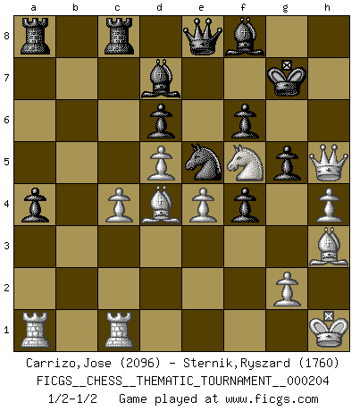 Last move : 1/2-1/2 2016 February 15 20:29:1 [Event "FICGS__CHESS__THEMATIC_TOURNAMENT__000204"] [Site "FICGS"] [Date "2016.01.11"] [Round "1"] [White "Carrizo,Jose"] [Black "Sternik,Ryszard"] [Result "1/2-1/2"] [WhiteElo "2096"] [BlackElo "1760"] 1.e4 e5 2.f4 exf4 3.Bc4 Nc6 4.Nf3 g5 5.O-O d6 6.d4 Bg7 7.c3 Qe7 8.b4 Bd7 9.b5 Na5 10.Bd3 Nh6 11.Nbd2 O-O 12.Nb3 Nxb3 13.axb3 Rfe8 14.h3 c5 15.bxc6 Bxc6 16.Bd2 f6 17.Re1 a5 18.Qc2 Nf7 19.c4 b6 20.Bc3 h6 21.d5 Bd7 22.Nd4 Qd8 23.Be2 Qc8 24.Kh2 Ne5 25.Nf5 Qc7 26.Kh1 Bf8 27.h4 Rec8 28.Rec1 Be8 29.Bd4 b5 30.Qd1 bxc4 31.bxc4 Bd7 32.Bg4 a4 33.Bh3 Qd8 34.Qh5 Qe8 35.Nxh6+ Kg7 36.Nf5+ 1/2-1/2 KGA : Bishop's gambit, Maurian defense Kingside Castling by player White (move 5) Kingside Castling by player Black (move 11) This chess game ended in a draw. Follow this game move after move (download)I like to say that Bobby Fischer was the greatest player ever. But what made Fischer a genius was his ability to blend an American freshness and pragmatism with Russian ideas about strategy. (Bruce Pandolfini) Vom Schach wurde gesagt das Leben sei dafür nicht lange genug. Aber das ist der Fehler des Lebens, nicht des Schach'. (Irving Chernev) Aquellos que dicen que entienden al Ajedrez, no entienden nada. (Robert Hubner) La solitude du joueur d'Echecs à l'approche du mat est semblable à celle du condamné. (Francis Szpiner) Whoever said the pen is mightier than the sword obviously never encountered automatic weapons. (US General Douglas MacArthur)