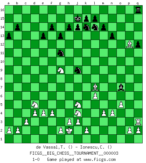 Last move : 1-0 2007 September 30 11:44:12 [Event "FICGS__BIG_CHESS__TOURNAMENT__000003"] [Site "FICGS"] [Date "2007.03.20"] [Round "1"] [White "de Vassal,Thibault"] [Black "Ionescu,Catalin"] [Result "1-0"] [WhiteElo ""] [BlackElo ""] 1.j2-h4 n15-n13 2.h1-o7 j15-h13 3.o7-o15 p16-q14 4.o15-f7 g16-f14 5.f7-l7 k16-l14 6.l7-c15 b16-c14 7.c15-n5 o16-k12 8.p1-o3 m15-m14 9.b1-c3 h16-m12 10.g1-f3 m16-o16 11.d2-d4 l16-o13 12.e2-e4 e15-e13 13.k1-l3 f16-b12 14.c1-g5 d15-d13 15.a1-d1 c16-g12 16.o3-m4 q14-o15 17.m4-k5 p15-p13 18.m2-m4 a16-d16 19.l1-p5 b12-d14 20.g5-k8 h15-k14 21.f1-c4 o13-k9 22.k5-j7 k9-h11 23.n2-n4 q15-q14 24.o1-g8 o15-m16 25.o2-o4 h13-j11 26.h2-j4 l14-j13 27.h4-j6 m16-l14 28.m1-m3 f14-h13 29.l3-k5 j16-j15 30.e1-e3 f15-f14 31.f3-g5 k12-m10 32.k8-j9 m12-o12 33.j7-h9 j11-h9 34.g8-h9 d14-c13 35.e3-f3 h11-l8 36.f3-f8 c13-a11 37.k5-m6 l8-p12 38.d1-d3 m10-g5 39.j6-g5 a11-b12 40.f8-d8 o12-o9 41.j9-e5 o16-o10 42.d8-d13 d16-d13 43.h9-d13 o10-d10 44.d13-m5 c14-a13 45.c3-d5 b12-c13 46.j1-h2 q16-o16 47.l2-l4 b15-b14 48.l4-l5 c13-d12 49.d3-a3 o9-b9 50.c4-b3 d12-g9 51.a3-a9 b9-b13 52.m5-l4 b13-c13 53.n5-p7 q14-q13 54.p7-g7 g9-d12 55.g7-d10 d12-a9 56.e5-a9 a13-b11 57.d10-a7 b11-a9 58.a7-a9 a15-a13 59.m3-k3 e16-d16 60.k3-k7 p12-k7 61.m6-k7 c13-d12 62.a9-l9 p13-p12 63.q1-o1 d12-d6 64.f2-f4 d6-d9 65.l9-p13 o16-q16 66.o1-o3 d16-p16 67.p13-j7 d9-b11 68.d5-e7 g12-p4 69.o3-p3 p4-g12 70.b3-p16 q16-p16 71.j7-f7 b11-f7 72.g5-f7 g12-f11 73.l5-l6 g15-g13 74.e7-d5 p16-c16 75.c2-c3 j13-k11 76.p3-q3 c16-q16 77.l4-j6 h13-g11 78.k7-j5 k11-j9 79.j6-p12 q13-q12 80.f7-g9 f11-h13 81.p5-m8 h13-p6 82.o4-o5 p6-o7 83.m8-l7 1-0 Follow this game move after move (download)The only thing Chess players have in common is Chess. (Lodewijk Prins) Wenn man heute mit 14 Jahren noch kein GM ist, kann man es vergessen. (Viswanathan Anand) No existe un remordimiento como el remordimiento del Ajedrez. (H. G. Wells) Les sacrifices démontrent seulement que quelqu'un a gaffé. (Savielly Tartacover) When the going gets tactical, the computers get going. (Hyatt)