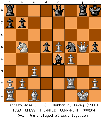 Last move : 0-1 2016 March 28 2:53:38 [Event "FICGS__CHESS__THEMATIC_TOURNAMENT__000204"] [Site "FICGS"] [Date "2016.01.11"] [Round "1"] [White "Carrizo,Jose"] [Black "Bukharin,Alexey"] [Result "0-1"] [WhiteElo "2096"] [BlackElo "1908"] 1.e4 e5 2.f4 exf4 3.Bc4 Nc6 4.Nf3 g5 5.O-O Bg7 6.d4 d6 7.c3 h6 8.Qa4 Bd7 9.Qb3 Na5 10.Bxf7+ Kf8 11.Qa3 Kxf7 12.Qxa5 Ne7 13.g3 Bh3 14.Rf2 Qd7 15.gxf4 Rhf8 16.Na3 Kg8 17.Qb5 c6 18.Qd3 d5 19.exd5 cxd5 20.Ne5 Bxe5 21.dxe5 Qg4+ 22.Kh1 Qh5 23.Bd2 Bf5 24.Qe2 Be4+ 25.Kg1 Qg6 26.Qg4 Kh8 27.Be3 Nf5 28.Bc1 h5 29.Qxg5 Qe8 30.Nb5 Rg8 0-1 KGA : Bishop's gambit, Maurian defense Kingside Castling by player White (move 5) Player Black won this chess game. Follow this game move after move (download)Capture of the adverse King is the ultimate but not the first object of the game. (William Steinitz) Die Auseinandersetzung mit Karpow war politisch geprägt. Er stand für das kommunistische System, wurde von dessen Repräsentanten gehätschelt. Ich war der Oppositionelle. Jeder Schachweltmeister spiegelt auch die gesellschaftlichen Verhältnisse wider. Kramnik steht für die Börsen-Generation des Neuen Markts, ideologiefrei, zahlenfixiert. (Garry Kasparov) El jugador táctico debe saber que hacer cuando algo se debe de hacer. El estratégico debe saber que hacer cuando nada se debe de hacer. (Savielly Tartakover) C'est la seule position que je connaisse où les deux camps sont mals. Propos prêtés à V. Anand. The best teachers teach from the heart, not from the book. (Author unknown)