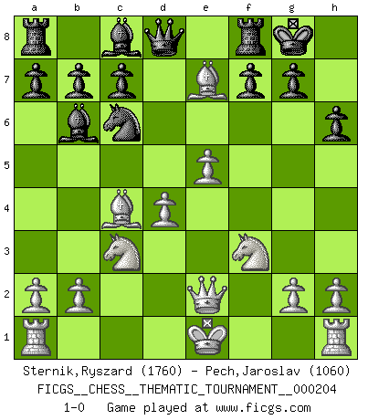 Last move : 1-0 2016 July 5 12:49:3 [Event "FICGS__CHESS__THEMATIC_TOURNAMENT__000204"] [Site "FICGS"] [Date "2016.01.11"] [Round "1"] [White "Sternik,Ryszard"] [Black "Pech,Jaroslav"] [Result "1-0"] [WhiteElo "1760"] [BlackElo "1060"] 1.e4 e5 2.f4 Bc5 3.Nf3 d6 4.c3 Nf6 5.d4 exd4 6.cxd4 Bb6 7.Nc3 O-O 8.e5 dxe5 9.fxe5 Nd5 10.Bg5 Ne7 11.Bc4 Nbc6 12.Qe2 h6 13.Bxe7 1-0 This chess game has been lost on time (started : 2016.01.11 16:5:25) KGD : Classical, 4.c3 Kingside Castling by player Black (move 7) Player White won this chess game. Follow this game move after move (download)Later, I began to succeed in decisive games. Perhaps because I realized a very simple truth: not only was I worried, but also my opponent. (Mikhail Tal) Im Spitzenschach von heute geht es nur um Vorbereitung, um tiefgründige, sorgfältige Eröffnungsvorbereitung. (Nigel Short) Los Peones son nacidos libres, y aún así, se encuentran por doquier encadenados. (Rick Kennedy) Si rien de grave n'est détecté lors de l'analyse d'une position, on joue alors le coup. Seconde règle de Blumenfeld. Even the best needles are not sharp at both ends. (Chinese proverb)