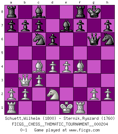 Last move : 0-1 2016 June 7 10:10:19 [Event "FICGS__CHESS__THEMATIC_TOURNAMENT__000204"] [Site "FICGS"] [Date "2016.01.11"] [Round "1"] [White "Schuett,Wilhelm"] [Black "Sternik,Ryszard"] [Result "0-1"] [WhiteElo "1800"] [BlackElo "1760"] 1.e4 e5 2.f4 exf4 3.Nf3 g5 4.d4 g4 5.Bxf4 gxf3 6.Qxf3 d6 7.Bc4 Qh4+ 8.Bg3 Qf6 9.Qb3 Nc6 10.c3 Nh6 11.Rf1 Qg6 12.Nd2 Be7 13.Bf4 O-O 0-1 This chess game has been lost on time (started : 2016.01.11 16:5:25) KGA : Rosentreter gambit Kingside Castling by player Black (move 13) Player Black won this chess game. Follow this game move after move (download)Who is your opponent tonight, tonight I am playing against the Black pieces. (Akiba Rubinstein) Jeder weiß, dass Gasprom Putins persönliches Machtinstrument ist. Die Firma wird vom Kreml aus geleitet und wird schon deshalb nie transparent sein. (Garry Kasparov) Si pudieramos observar el interior de la cabeza de un jugador de Ajedrez, encontraríamos ahí un mundo lleno de sentimientos, imágenes, ideas, emoción y pasión. (Alfred Binet) On croit qu'il y a plus de mauvais joueurs que de bons joueurs, c'est faux : Il y a autant de joueurs qui gagnent que de joueurs qui perdent. (Philippe Geluck) Strategy without tactics is the slowest route to victory. Tactics without strategy is the noise before defeat. (Sun Tzu)