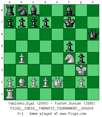 Last move : 0-1 2016 April 4 8:49:4 [Event "FICGS__CHESS__THEMATIC_TOURNAMENT__000204"] [Site "FICGS"] [Date "2016.01.11"] [Round "1"] [White "Yablonko,Eyal"] [Black "Foster,Duncan"] [Result "0-1"] [WhiteElo "2000"] [BlackElo "1585"] 1.e4 e5 2.f4 exf4 3.Nf3 g5 4.Nc3 g4 5.Ne5 h5 6.Bc4 Qh4+ 7.Kf1 Rh7 8.Nd5 Nf6 9.Nxf4 Nxe4 10.Qe2 Ng3+ 11.hxg3 Qxh1+ 12.Kf2 f5 13.Bf7+ Rxf7 14.Nxf7 Kxf7 15.b4 h4 16.Bb2 hxg3+ 17.Kxg3 Qh6 0-1 KGA : Quaade gambit Player Black won this chess game. Follow this game move after move (download)The stomach is an essential part of the Chess master. (Bent Larsen) Ein Schachgenie ist jemand der verdammt gut Schach spielt. (Jonathan Levitt) ¿Se han dado cuenta de que Fischer casi nunca ha tenido piezas malas? El las intercambia y las piezas malas se quedan con sus oponenets. (Yuri Balashov) Le plus grand jeu de l'esprit jamais inventé, plus vous l'apprenez, plus vous y prenez du plaisir. (Garry Kasparov) If you are good, you will be assigned all the work. If you are really good, you will get out of it. (Dan Rotaru)