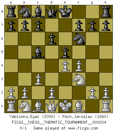 Last move : 0-1 2016 March 23 18:55:24 [Event "FICGS__CHESS__THEMATIC_TOURNAMENT__000204"] [Site "FICGS"] [Date "2016.01.11"] [Round "1"] [White "Yablonko,Eyal"] [Black "Pech,Jaroslav"] [Result "0-1"] [WhiteElo "2000"] [BlackElo "1060"] 1.e4 e5 2.f4 Bc5 3.Nf3 d6 4.c3 Nf6 0-1 This chess game has been lost on time (started : 2016.01.11 16:5:25) KGD : Classical, 4.c3 Player Black won this chess game. Follow this game move after move (download)Do you realize Fischer almost never has any bad pieces? He exchanges them, and the bad pieces remain with his opponents. (Yuri Balashov) Es war undenkbar für die Behörden, dass ein sowjetischer Großmeister auf diese Art und Weise [Fischer-Taimanov 6:0] verliert, ohne dass es eine politischer Erklärung dafür gäbe. (Mark Taimanov) El jugador blanco perdió porque fallo en recordar la coreccta continuación y tuvo que pensar por sí mismo las movidas. (Siegbert Tarrasch) Ne tendez aucun piège pour le plaisir ! Ne jouez rien dans l'espoir que l'adversaire réagisse de façon stupide ! Prenez toujours pour acquis que l'adversaire va trouver le meilleur coup ! Ne jouez jamais de coup dans l'espoir que l'adversaire ne voie pas la menace ! Chacun de vos coups doit améliorer la position d'une façon ou d'une autre. All maxims have their antagonist maxims; proverbs should be sold in pairs, a single one being but a half truth. (William Mathews)