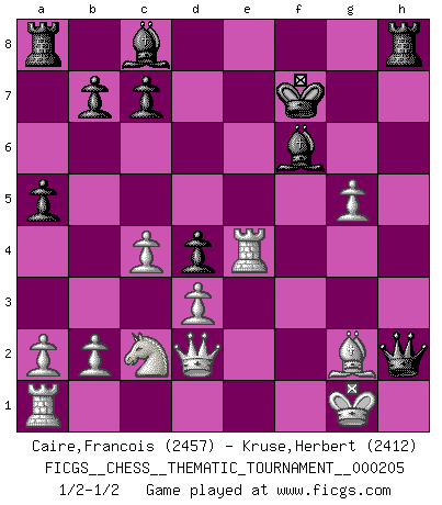Last move : 1/2-1/2 2016 April 16 14:58:23 [Event "FICGS__CHESS__THEMATIC_TOURNAMENT__000205"] [Site "FICGS"] [Date "2016.01.16"] [Round "1"] [White "Caire,Francois"] [Black "Kruse,Herbert"] [Result "1/2-1/2"] [WhiteElo "2457"] [BlackElo "2412"] 1.f4 d5 2.c4 e5 3.fxe5 d4 4.Nf3 Nc6 5.d3 Nge7 6.g3 Ng6 7.Bg2 Ngxe5 8.O-O Be7 9.Na3 h5 10.Nc2 Nxf3+ 11.exf3 a5 12.Re1 h4 13.Bg5 hxg3 14.hxg3 f6 15.Bd2 Ne5 16.Bf4 Kf7 17.Bxe5 fxe5 18.Qd2 Qd6 19.f4 exf4 20.Re4 g5 21.gxf4 Bf6 22.fxg5 Qh2+ 1/2-1/2 Mujannah Opening Kingside Castling by player White (move 8) This chess game ended in a draw. Follow this game move after move (download)I'm not a materialistic person, in that, I don't suffer the lack or loss of money. The absence of worldly goods I don't look back on. For Chess is a way I can be as materialistic as I want without having to sell my soul. (Jamie Walter Adams) Die meiste Zeit treffe ich auf Gegner, die meine Enkel sein könnten. Ich bin da, um ihnen zu zeigen, dass sie von mir noch einiges lernen können. (Viktor Kortschnoi) Vive, pierde y aprende al observar a tu oponente como ganar. (Amber Steenbock) Le temps de noter son nom sur la feuille de partie, j'étais déjà en zeitnot ! D'un modeste amateur apparié lors de la première ronde d'un open contre le grand-maître Azmaïparashvili. I know the human being and fish can coexist peacefully. (George W. Bush, Saginaw sept. 29, 2000)