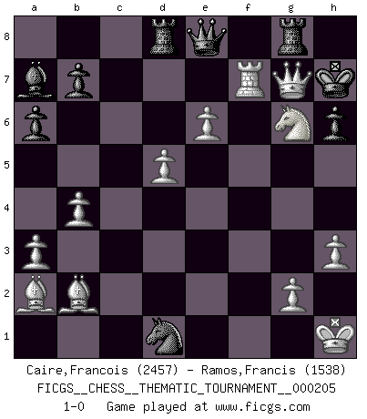 Last move : 1-0 2016 March 14 14:55:45 [Event "FICGS__CHESS__THEMATIC_TOURNAMENT__000205"] [Site "FICGS"] [Date "2016.01.16"] [Round "1"] [White "Caire,Francois"] [Black "Ramos,Francis"] [Result "1-0"] [WhiteElo "2457"] [BlackElo "1538"] 1.f4 d5 2.c4 e5 3.fxe5 dxc4 4.e3 Nc6 5.Nf3 Bc5 6.Bxc4 Nge7 7.O-O O-O 8.d4 Bb6 9.Nc3 Bg4 10.h3 Bh5 11.a3 a6 12.Ba2 Kh8 13.Qe1 Nd5 14.Nxd5 Ba7 15.Nf4 Bg6 16.Nxg6+ fxg6 17.b4 Qe7 18.Bb2 Rad8 19.Kh1 h6 20.e6 Qe8 21.d5 Ne7 22.Qc3 Rg8 23.e4 c6 24.Rad1 cxd5 25.exd5 Nf5 26.Ne5 Ne3 27.Rf7 Nxd1 28.Nxg6+ Kh7 29.Qxg7+ 1-0 Mujannah Opening Kingside Castling by player White (move 7) Kingside Castling by player Black (move 7) Player White won this chess game. Follow this game move after move (download)After black's reply to 1.e4 with 1..e5, leaves him always trying to get into the game. (Howard Staunton) Spiel ein langweiliges Spiel zu Ende und lustige Dinge können passieren. (Hans Ree) En la vida, como en el Ajedrez, los Peones propios obstruyen nuestro camino. La gran fortuna de un hombre, su comodidad, placer, hijos, libros, que deberían ayudarle a ganar, con mucha frecuencia lo ponen en Jaque Mate. (Charles Buxton) La tactique, c'est ce que vous faites quand il y a quelque chose à faire; la stratégie, c'est ce que vous faites quand il n'y a rien à faire. (Savielli Tartacower) It is not enough to be a good player... you must also play well. (Siegbert Tarrasch)