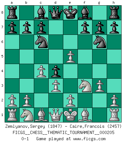 Last move : 0-1 2016 March 21 6:51:38 [Event "FICGS__CHESS__THEMATIC_TOURNAMENT__000205"] [Site "FICGS"] [Date "2016.01.16"] [Round "1"] [White "Zemlyanov,Sergey"] [Black "Caire,Francois"] [Result "0-1"] [WhiteElo "1847"] [BlackElo "2457"] 1.f4 d5 2.c4 e5 3.fxe5 d4 4.d3 Nc6 5.Nf3 Nge7 6.g3 Ng6 0-1 This chess game has been lost on time (started : 2016.01.16 13:54:4) Mujannah Opening Player Black won this chess game. Follow this game move after move (download)I feel as if I were a piece in a game of Chess, when my opponent says of it: That piece cannot be moved. (Soren Kierkegaard) Wer nie einen Fehler gemacht hat, hat nie etwas Neues ausprobiert. (Albert Einstein) El Ajedrez es un juego de pelea el cual es puramente intelectual e incluye la suerte. (Richard Reti) Pour moi, les échecs ne sont pas un jeu mais un art. (Alexandre Alekhine) A married woman is like a fish riding a bicycle. (Rodolfo d'Ettorre)