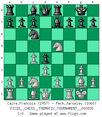 Last move : 1-0 2016 July 25 3:58:23 [Event "FICGS__CHESS__THEMATIC_TOURNAMENT__000205"] [Site "FICGS"] [Date "2016.01.16"] [Round "1"] [White "Caire,Francois"] [Black "Pech,Jaroslav"] [Result "1-0"] [WhiteElo "2457"] [BlackElo "1060"] 1.f4 d5 2.c4 e5 3.fxe5 d4 4.Nf3 Ne7 5.g3 Ng6 6.d3 Nc6 7.Bg2 Ngxe5 8.O-O Be7 9.Na3 O-O 10.Nc2 Re8 11.Nxe5 1-0 This chess game has been lost on time (started : 2016.01.16 13:54:4) Mujannah Opening Kingside Castling by player White (move 8) Kingside Castling by player Black (move 9) Player White won this chess game. Follow this game move after move (download)Bobby Fischer is the greatest Chess genius of all time ! (Alexander Kotov) Moralische Siege zählen nicht. (Savielly Grigorievitsch Tartakower) Cuando me preguntan: -¿Cual es el secreto que te hace hacer mejores movidas que tus oponentes?, Yo respondo: Me da gusto que me pregunten eso, porque, como veran, hay una simple razón. Yo pienso mis propias movidas y dejo a mi oponente que el piense las suyas. (Alexander Alekhine) Ce qui caractérise les parties de combat, c'est que si le défenseur a constamment de difficiles problèmes à résoudre, l'attaquant doit chercher sans relâche de nouvelles possibilités d'attaque. (Koblentz) The next best thing to gambling and winning is gambling and loosing. (Nick Dandalos)