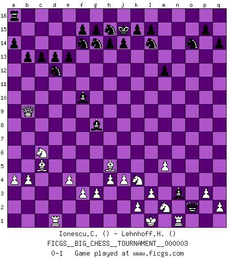 Last move : 0-1 2007 September 24 21:7:39 [Event "FICGS__BIG_CHESS__TOURNAMENT__000003"] [Site "FICGS"] [Date "2007.03.20"] [Round "1"] [White "Ionescu,Catalin"] [Black "Lehnhoff,Heinz-Georg"] [Result "0-1"] [WhiteElo ""] [BlackElo ""] 1.j2-k4 j15-g14 2.h1-o7 m15-m13 3.n2-n4 e15-e13 4.m2-m4 n15-n13 5.o7-o15 h16-k14 6.o15-q13 p16-o14 7.q13-g4 d15-d13 8.d2-d4 b16-c14 9.c1-p13 q15-q14 10.p13-f4 l16-p12 11.g4-g7 m13-m12 12.e2-e4 o16-k12 13.l1-o4 f16-b12 14.g7-n7 b12-e9 15.l2-l3 m16-m13 16.f1-c4 m13-j13 17.h2-j4 c16-f13 18.f2-f3 f13-e12 19.o2-o3 k12-l11 20.c2-c3 q16-m16 21.b1-d2 e9-h12 22.n7-h7 c14-d12 23.k1-h2 e12-j8 24.h7-a7 e16-e14 25.b2-b4 p12-n14 26.c4-n14 k14-n14 27.j4-h6 j8-h9 28.a2-a4 e14-f14 29.g1-e2 c15-c13 30.o1-j6 n14-o13 31.p2-p3 o13-g6 32.p1-n2 h9-e12 33.e1-g1 a15-a14 34.j6-h5 g6-c6 35.f4-g3 c6-h6 36.g3-f4 f14-f4 37.e2-f4 h6-f4 38.a1-d1 j13-j7 39.a7-c5 j7-c7 40.c5-n15 m16-m15 41.n15-n13 c7-c3 42.d2-b1 c3-c4 43.o4-h10 c4-d4 44.d1-d4 l11-d4 45.g1-d1 d4-e5 46.d1-h1 h12-c7 47.n2-l1 f4-g3 48.h5-g4 e12-c10 49.j3-j4 g3-h4 50.h10-c5 k16-l14 51.l1-k3 h4-o10 52.n13-n5 c10-d11 53.b1-d2 d11-l4 54.j1-k1 e5-h2 55.k1-l2 h2-f4 56.d2-c4 m15-m13 57.h1-d1 m13-n13 58.n5-l5 o10-o7 59.m4-m5 l4-g8 60.c4-a5 o7-o3 61.k3-m2 o3-o10 62.h3-h4 g16-f14 63.k4-j2 f4-h2 64.l5-g9 o10-j10 65.g4-h5 j16-j15 66.m2-k3 h2-f4 67.a5-c6 c7-f10 68.g9-b9 b15-b13 69.g2-g3 f4-j7 70.j2-k4 n13-n4 71.q1-n1 j10-o5 72.l2-l1 n4-n1 73.m1-n1 j7-n3 74.k3-m2 o5-o2 0-1 Follow this game move after move (download)Later, I began to succeed in decisive games. Perhaps because I realized a very simple truth: not only was I worried, but also my opponent. (Mikhail Tal) Es liegt in der Natur, vernüftig zu denken und unlogisch zu handeln. (Anatole France) Un buen sacrificio es aquel que aunque no sea necesariamente sólido, deja a tu oponente aturdido y confuso. (Rudolph Spielmann) Si rien de grave n'est détecté lors de l'analyse d'une position, on joue alors le coup. Seconde règle de Blumenfeld. Go and wake up your luck. (Persian saying)