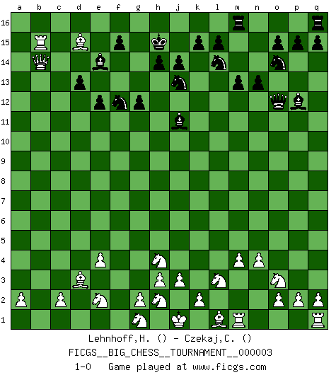 Last move : 1-0 2007 June 26 12:52:49 [Event "FICGS__BIG_CHESS__TOURNAMENT__000003"] [Site "FICGS"] [Date "2007.03.20"] [Round "1"] [White "Lehnhoff,Heinz-Georg"] [Black "Czekaj,Christophe"] [Result "1-0"] [WhiteElo ""] [BlackElo ""] 1.j2-h4 g15-g13 2.e2-e4 h16-c11 3.d2-d4 c11-l11 4.b1-c3 l11-l2 5.k1-l3 n15-n13 6.c1-h6 p16-o14 7.h2-k3 l2-p6 8.h6-k4 p6-d6 9.k3-h2 d6-d4 10.f1-d3 d4-f2 11.n2-n4 g16-f14 12.h1-l4 k16-l14 13.l4-c12 d15-d13 14.c12-c15 e15-e13 15.c15-c6 f2-f10 16.m2-m4 h15-j13 17.e1-f1 f10-b14 18.k4-l5 b14-b2 19.a1-b1 b2-a3 20.f1-f14 c16-e14 21.b1-b3 a3-c1 22.c3-e2 c1-l9 23.b3-b15 g13-g12 24.f14-f9 l9-o12 25.p1-o3 m15-m13 26.c6-a8 e13-e12 27.b15-a15 a16-a15 28.a8-a15 b16-d15 29.f9-b9 l16-p12 30.b9-b15 f16-c13 31.l5-c13 d15-c13 32.a15-c13 j16-h15 33.c13-b14 j15-g14 34.o1-b13 e16-e15 35.b15-e15 o16-j11 36.e15-b15 g14-f12 37.b13-d15 1-0 Follow this game move after move (download)In life, as in Chess, one's own Pawns block one's way. A man's very wealth, ease, leisure, children, books, which should help him to win, more often checkmate him. (Charles Buxton) Unter Putin wird alles Geld aus Russland wie von einem Staubsauger nach Moskau umgeleitet, das ist wie ein schwarzes Loch. (Garry Kasparov) El Ajedrez expande y enriquece tu mente. (Saudin Robovic) Le jeu d'échecs fait naître et fortifie en nous plusieurs qualités précieuses dans le cours de l'existence, telles que la prévoyance, la circonspection, la prudence, et la persévérance. (Benjamin Franklin - 1783, la morale des échecs) Faith : not wanting to know what is true. (Friedrich Nietzsche)
