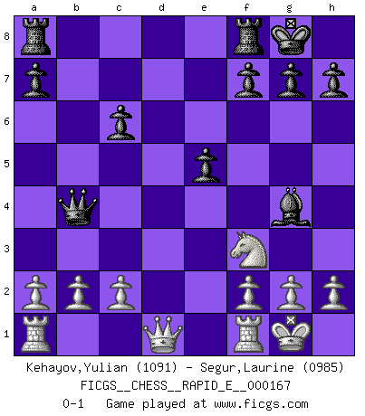 Last move : 0-1 2016 March 30 8:35:14 [Event "FICGS__CHESS__RAPID_E__000167"] [Site "FICGS"] [Date "2016.01.17"] [Round "1"] [White "Kehayov,Yulian"] [Black "Segur,Laurine"] [Result "0-1"] [WhiteElo "1091"] [BlackElo "0985"] 1.e4 c5 2.d4 cxd4 3.Qxd4 Nc6 4.Qd1 Nf6 5.Bd3 d5 6.exd5 Qxd5 7.Nf3 e5 8.Nc3 Bb4 9.Bd2 Qd6 10.O-O Bg4 11.Ne4 Nxe4 12.Bxe4 O-O 13.Bxb4 Qxb4 14.Bxc6 bxc6 0-1 This chess game has been lost on time (started : 2016.01.17 12:11:29) Sicilian : Smith-Morra gambit Kingside Castling by player White (move 10) Kingside Castling by player Black (move 12) Player Black won this chess game. Follow this game move after move (download)Not all artists are Chess players, but all Chess players are artists. (Marcel Duchamp) Ich glaube nicht an Psychologie, ich glaube an gute Züge. (Robert James Fischer) No existe un remordimiento como el remordimiento del Ajedrez. (H. G. Wells) L'action d'une oeuvre littéraire se déroule sur un champ de bataille. Les masques et les types du drame moderne correspondent aux pièces du jeu d'échecs. L'intrigue correspond aux coups et aux gambits, c'est à dire aux techniques du jeu telles qu'utilisées et interprétées par les joueurs. Les tactiques et les péripéties [mouvements] correspondent aux coups exécutés par l'adversaire. (Viktor Shklovsky) Mac users swear by their computers. PC users swear at their computers. (Author unknown)