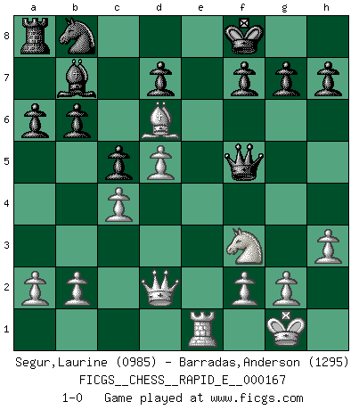 Last move : 1-0 2016 February 27 23:18:1 [Event "FICGS__CHESS__RAPID_E__000167"] [Site "FICGS"] [Date "2016.01.17"] [Round "1"] [White "Segur,Laurine"] [Black "Barradas,Anderson"] [Result "1-0"] [WhiteElo "0985"] [BlackElo "1295"] 1.e4 c5 2.Nc3 e6 3.Nf3 a6 4.d4 b6 5.Be3 Bb7 6.d5 Bd6 7.Qd2 Ne7 8.Be2 Qc7 9.Rd1 exd5 10.exd5 O-O 11.O-O Ng6 12.Ne4 Ne7 13.c4 Re8 14.Nxd6 Qxd6 15.Bf4 Qg6 16.Bd3 Qh5 17.h3 Nf5 18.Rfe1 Rxe1+ 19.Rxe1 Kf8 20.Bxf5 Qxf5 21.Bd6+ 1-0 Sicilian : Closed Kingside Castling by player Black (move 10) Kingside Castling by player White (move 11) Player White won this chess game. Follow this game move after move (download)Help your pieces so they can help you. (Paul Morphy) Viele Opfer benötigen überhaupt keine konkrete Berechnung. Es genügt sich die entstehende Position kurz vorzustellen, um uns davon zu überzeugen, dass das Opfer korrekt ist. (Mikhail Nekhemyevich Tal) Mi estilo es algo parecido entre un poco de Tal y Petrosian. (Reshevsky) Demandez au pauvre Cg1 ce qu'il en pense. Eduard Gufeld à propos de la variante Saemisch de l'Est-Indienne. Every now and then a man's mind is stretched by a new idea and never shrinks back to its former dimensions. (Oliver Wendell Holmes, Sr.)