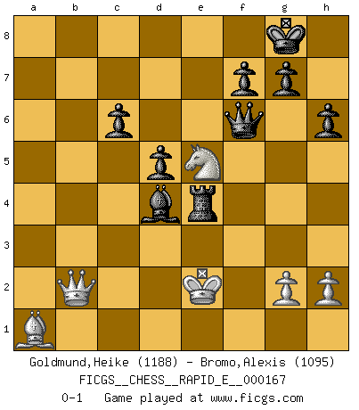 Last move : 0-1 2016 March 4 12:15:40 [Event "FICGS__CHESS__RAPID_E__000167"] [Site "FICGS"] [Date "2016.01.17"] [Round "1"] [White "Goldmund,Heike"] [Black "Bromo,Alexis"] [Result "0-1"] [WhiteElo "1188"] [BlackElo "1095"] 1.e4 e5 2.Nf3 Nc6 3.Bc4 h6 4.c3 Nf6 5.d3 a6 6.O-O Bc5 7.b4 Bb6 8.a4 d6 9.Bb2 O-O 10.Nbd2 Be6 11.Re1 Re8 12.b5 axb5 13.axb5 Na5 14.Bxe6 Rxe6 15.Nb3 Nxb3 16.Qxb3 Ng4 17.Re2 Rxa1+ 18.Bxa1 c6 19.bxc6 bxc6 20.Ra2 Bxf2+ 21.Kh1 Be3 22.d4 Nf2+ 23.Kg1 Nd3 24.Kf1 Nc1 25.Qa3 Nxa2 26.Qxa2 exd4 27.cxd4 Rxe4 28.Qb2 d5 29.Ne5 Qf6+ 30.Ke2 Bxd4 0-1 King's pawn game Kingside Castling by player White (move 6) Kingside Castling by player Black (move 9) Player Black won this chess game. Follow this game move after move (download)Chess is a fairy tale of 1001 blunders. (Savielly Tartakower) Gewöhnliche Menschen denken nur daran, wie sie ihre Zeit verbringen. Ein intelligenter Mensch versucht, sie auszunutzen. (Arthur Schopenhauer) En el Ajedrez, tal como es jugado por los Maestros, practicamente la suerte es eliminada. (Emanuel Lasker) Celui qui prend des risques peut perdre, celui qui n'en prend pas perd toujours. (Xavier Tartacover) You must have a dream in order to have it come true. (A.P.J. Kalam)