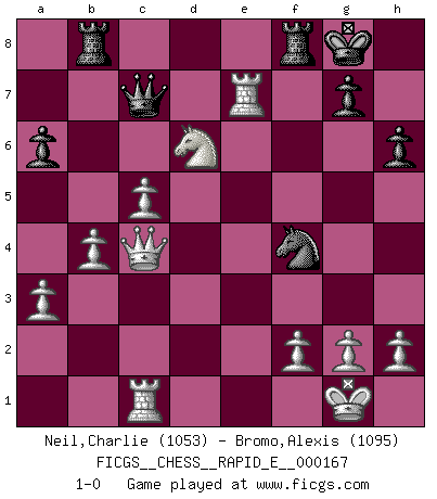 Last move : 1-0 2016 April 11 21:38:57 [Event "FICGS__CHESS__RAPID_E__000167"] [Site "FICGS"] [Date "2016.01.17"] [Round "1"] [White "Neil,Charlie"] [Black "Bromo,Alexis"] [Result "1-0"] [WhiteElo "1053"] [BlackElo "1095"] 1.d4 d5 2.Nf3 c5 3.dxc5 e6 4.b4 a6 5.Bb2 Nf6 6.e3 Nc6 7.a3 Bd7 8.Nbd2 Be7 9.Be2 h6 10.O-O O-O 11.c4 dxc4 12.Nxc4 Nd5 13.Qd2 Bf6 14.Nd6 Qc7 15.Bxf6 Nxf6 16.e4 e5 17.Qc3 Be6 18.Rad1 Rad8 19.Nxe5 Nxe5 20.Qxe5 Bb3 21.Rc1 Qc6 22.Bf3 Nd7 23.Qc3 Be6 24.e5 Qc7 25.Nxb7 Rb8 26.Nd6 Rfd8 27.Rfe1 f6 28.exf6 Nxf6 29.Rxe6 Rf8 30.Bd5 Nxd5 31.Qc4 Nf4 32.Re7 1-0 Queen's pawn game, Krause variation Kingside Castling by player White (move 10) Kingside Castling by player Black (move 10) Player White won this chess game. Follow this game move after move (download)Every Pawn is a potential Queen. (James Mason) Die westlichen Werte sind eine Sprache, welche die Putin-Administration nicht versteht. (Garry Kasparov) Sin errores no puede haber brillantez. (Emanuel Lasker) 'L'échange des dames est un coup dur pour les deux adversaires...' Un journaliste lors d'une partie du match Spassky-Fischer Follow your passion, and success will follow you. (Arthur Buddhold)