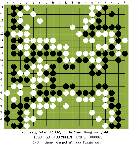 Last move : 1-0 2016 August 1 23:26:30 [Event "FICGS__GO__TOURNAMENT_KYU_I__000061"] [Site "FICGS"] [Date "2016.01.18"] [Round "1"] [Black "Korossy,Peter"] [White "Bartner,Douglas"] [Result "1-0"] [Rating 1 "1382"] [Rating 2 "1441"] 1.q16 q4 2.d4 d16 3.c14 f17 4.b16 c17 5.b17 c6 6.c8 e6 7.d11 f4 8.e3 f3 9.c4 k4 10.q10 o17 11.o16 n16 12.p17 n17 13.r13 n14 14.r6 o3 15.s4 r3 16.s3 r14 17.q14 e14 18.k10 k12 19.g13 h14 20.j12 j13 21.h12 g14 22.e5 f5 23.f6 e7 24.f7 e8 25.h6 c9 26.b9 d9 27.b10 c7 28.b8 f8 29.h7 e4 30.d5 e10 31.e11 f10 32.g9 g8 33.h8 f11 34.f12 g10 35.h10 b5 36.b4 f9 37.h9 b7 38.d8 d2 39.c2 e2 40.a2 b2 41.b1 a6 42.d10 b3 43.a3 h4 44.n6 m5 45.m6 n5 46.o6 r15 47.r16 q15 48.p14 p15 49.o15 o14 50.p16 s13 51.r12 s12 52.s16 p13 53.s11 q13 54.q12 o11 55.o9 d13 56.c12 c13 57.b13 d12 58.b12 d14 59.m11 m12 60.n11 n12 61.o10 p11 62.q11 q6 63.q7 q5 64.r5 p6 65.p7 d3 66.c3 c15 67.b14 l6 68.l7 k6 69.k7 o18 70.p18 p10 71.p9 k11 72.j11 l11 73.l10 k13 74.t12 t14 75.b18 c18 76.c19 d19 77.b19 e18 78.s15 b15 79.a15 h5 80.j6 o5 81.s14 p19 82.q19 o19 83.r18 f13 84.e12 h13 85.g12 j5 86.n15 m15 87.c16 d15 88.p12 o12 89.s2 r2 90.r1 q1 91.s1 p2 92.e13 f14 93.g5 g4 94.g6 d1 95.r4 l16 96.c1 pass 97.pass 1-0 Here are the names of the openings (joseki) played in the four corners : Corner d16 : d16 c14 Hoshi (Hwajeom, Seongjeom, Xingwei`) 4-4 Point. The star or hoshi (4-4) point, emphasizing influence at the potential expense of territory. Ikken Kakari (Hankan Keolch'im, Yi Gua`jiao~, 1-Space Low Approach). Black 2 is the standard approach move to the 4-4. Corner d4 : d4 c6 Hoshi (Hwajeom, Seongjeom, Xingwei`) 4-4 Point. The star or hoshi (4-4) point, emphasizing influence at the potential expense of territory. Ikken Kakari (Hankan Keolch'im, Yi Gua`jiao~, 1-Space Low Approach). White 2 is the standard approach move to the 4-4. Corner q16 : q16 o17 Hoshi (Hwajeom, Seongjeom, Xingwei`) 4-4 Point. The star or hoshi (4-4) point, emphasizing influence at the potential expense of territory. Ikken Kakari (Hankan Keolch'im, Yi Gua`jiao~, 1-Space Low Approach). White 2 is the standard approach move to the 4-4. Corner q4 : q4 r6 Hoshi (Hwajeom, Seongjeom, Xingwei`) 4-4 Point. The star or hoshi (4-4) point, emphasizing influence at the potential expense of territory. Ikken Kakari (Hankan Keolch'im, Yi Gua`jiao~, 1-Space Low Approach). Black 2 is the standard approach move to the 4-4. Player Black won this Go (weiqi, baduk) game. Follow this game move after move (download)Five groups might live but the six will die. (Anonymous) Those who make the worst use of their time are the first to complain of its brevity. (Jean de la Bruyere)