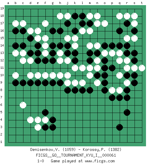 Last move : 1-0 2016 July 10 20:0:59 [Event "FICGS__GO__TOURNAMENT_KYU_I__000061"] [Site "FICGS"] [Date "2016.01.18"] [Round "1"] [Black "Denisenkov,Valentin"] [White "Korossy,Peter"] [Result "1-0"] [Rating 1 "1059"] [Rating 2 "1382"] 1.q16 d16 2.q3 d4 3.f3 f4 4.g4 e3 5.f5 e4 6.g3 c6 7.r5 o17 8.r14 l16 9.c14 c12 10.e14 f17 11.b16 c17 12.c9 d10 13.d9 e10 14.e9 f10 15.f9 b17 16.c16 e16 17.d15 b13 18.b14 c13 19.d13 e15 20.e12 d12 21.g12 g10 22.g9 h10 23.h9 h12 24.g13 h13 25.h14 f14 26.g14 f13 27.f12 f15 28.e13 k14 29.h16 j15 30.g16 h18 31.j17 j18 32.l17 m16 33.k18 m18 34.m17 n17 35.l18 n18 36.k16 k15 37.j13 j12 38.k13 m14 39.j14 l11 40.k12 j10 41.m13 n14 42.m12 b10 43.b9 j9 44.j8 k11 45.o12 q18 46.r17 r18 47.l8 l9 48.m8 k9 49.k8 q10 50.r8 q13 51.r13 q12 52.n10 r12 53.q14 p13 54.p14 o13 55.o8 q8 56.q7 p8 57.p7 r9 58.r7 s15 59.s16 s18 60.s12 s11 61.s13 n9 62.o9 n11 63.o11 m10 64.o10 n12 65.n13 m11 66.o14 r15 67.s10 r11 68.s9 t11 69.r10 s17 70.p11 1-0 Here are the names of the openings (joseki) played in the four corners : Corner d4 : d4 f3 Hoshi (Hwajeom, Seongjeom, Xingwei`) 4-4 Point. The star or hoshi (4-4) point, emphasizing influence at the potential expense of territory. Ikken Kakari (Hankan Keolch'im, Yi Gua`jiao~, 1-Space Low Approach). Black 2 is the standard approach move to the 4-4. Corner q16 : q16 o17 Hoshi (Hwajeom, Seongjeom, Xingwei`) 4-4 Point. The star or hoshi (4-4) point, emphasizing influence at the potential expense of territory. Ikken Kakari (Hankan Keolch'im, Yi Gua`jiao~, 1-Space Low Approach). White 2 is the standard approach move to the 4-4. Corner d16 : d16 c14 Hoshi (Hwajeom, Seongjeom, Xingwei`) 4-4 Point. The star or hoshi (4-4) point, emphasizing influence at the potential expense of territory. Ikken Kakari (Hankan Keolch'im, Yi Gua`jiao~, 1-Space Low Approach). Black 2 is the standard approach move to the 4-4. Player Black won this Go (weiqi, baduk) game. Follow this game move after move (download)Don't defend - extend ! (Bill Taylor) Luck never made a man wise. (Seneca, Letters to Lucilius)