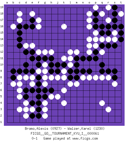 Last move : 0-1 2016 March 18 11:43:40 [Event "FICGS__GO__TOURNAMENT_KYU_I__000061"] [Site "FICGS"] [Date "2016.01.18"] [Round "1"] [Black "Bromo,Alexis"] [White "Walzer,Karel"] [Result "0-1"] [Rating 1 "0927"] [Rating 2 "1230"] 1.q16 d4 2.d16 q4 3.q10 k4 4.d10 k16 5.k10 f17 6.e17 f16 7.e16 o17 8.p17 o16 9.p16 o14 10.p14 o12 11.p12 l12 12.m11 g12 13.f11 f12 14.e12 c8 15.c9 d8 16.d9 r8 17.r9 q8 18.q9 o8 19.o9 n8 20.n9 f9 21.f10 g9 22.e9 e8 23.b8 b7 24.b9 k9 25.l9 k8 26.l8 l7 27.m8 m7 28.j9 l10 29.m9 j8 30.h9 h8 31.h10 g10 32.h11 h12 33.g11 k11 34.j10 l11 35.m10 m12 36.n11 p13 37.q13 o13 38.o11 q12 39.p11 q14 40.r13 p15 41.q15 r14 42.s13 s14 43.r15 r17 44.s16 q18 45.p18 o18 46.s17 p19 47.s18 r19 48.s19 s15 49.r16 e13 50.e11 d13 51.d12 c17 52.c16 b16 53.c15 c18 54.c13 e18 55.c14 r3 56.t16 t18 57.t14 p14 58.t15 c3 59.s8 s7 60.s9 p8 61.f8 g8 62.f7 c6 63.e6 h5 64.g6 k6 65.f5 g4 66.f4 g3 67.f3 e3 68.f2 g2 69.e2 d2 70.e4 d3 71.d5 c5 72.d6 g7 73.g5 e7 74.f6 c7 75.h6 j5 0-1 Here are the names of the openings (joseki) played in the four corners : Corner d16 : d16 f17 Hoshi (Hwajeom, Seongjeom, Xingwei`) 4-4 Point. The star or hoshi (4-4) point, emphasizing influence at the potential expense of territory. Ikken Kakari (Hankan Keolch'im, Yi Gua`jiao~, 1-Space Low Approach). White 2 is the standard approach move to the 4-4. Corner q16 : q16 o17 Hoshi (Hwajeom, Seongjeom, Xingwei`) 4-4 Point. The star or hoshi (4-4) point, emphasizing influence at the potential expense of territory. Ikken Kakari (Hankan Keolch'im, Yi Gua`jiao~, 1-Space Low Approach). White 2 is the standard approach move to the 4-4. Player White won this Go (weiqi, baduk) game. Follow this game move after move (download)Territory is a closed space where time no longer exists. The transformation around it slower alter it, and sometimes it cracks open like a rotten egg at the least shock. (Pierre Audouard) Kids, you tried your best and you failed miserably. The lesson is, never try. (Simpsons)