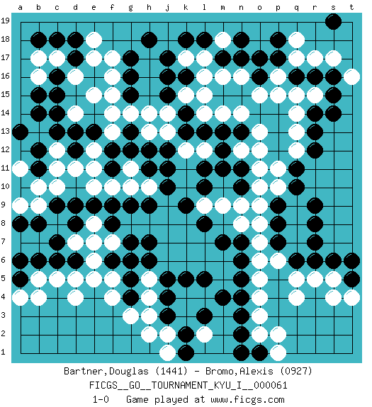 Last move : 1-0 2016 June 2 19:34:14 [Event "FICGS__GO__TOURNAMENT_KYU_I__000061"] [Site "FICGS"] [Date "2016.01.18"] [Round "1"] [Black "Bartner,Douglas"] [White "Bromo,Alexis"] [Result "1-0"] [Rating 1 "1441"] [Rating 2 "0927"] 1.r16 d4 2.d17 q4 3.c15 e15 4.g16 f15 5.g15 g14 6.d13 e12 7.d12 d11 8.e13 f13 9.f12 e11 10.g13 f14 11.h12 h14 12.j16 k15 13.k16 l16 14.j15 j14 15.k14 l15 16.k13 f16 17.g17 f17 18.k18 l17 19.l18 k17 20.j17 m18 21.h18 j13 22.j12 k12 23.l13 l12 24.m13 m14 25.n13 n14 26.j10 o13 27.n11 n12 28.m12 o12 29.l11 o11 30.n10 o10 31.p17 p15 32.r14 q14 33.r13 q13 34.r12 q12 35.q11 p11 36.q10 n9 37.l10 l14 38.m11 m9 39.r6 r5 40.q6 q5 41.n3 o3 42.n4 o4 43.j4 h4 44.j3 h3 45.c6 c5 46.d6 d5 47.c9 c10 48.d9 e6 49.f9 f7 50.b12 b9 51.b8 b10 52.b6 b5 53.f11 f10 54.h11 g10 55.g9 e10 56.e9 h10 57.h9 d14 58.c14 d16 59.c16 e17 60.d18 e18 61.h7 g6 62.h6 h5 63.j5 j2 64.k2 h2 65.a5 a4 66.a6 b4 67.n6 o5 68.n5 o6 69.s6 s5 70.t5 t4 71.t6 s4 72.n17 n16 73.o16 o15 74.m17 m16 75.p8 p6 76.p7 q7 77.r8 o7 78.n2 o2 79.o1 p1 80.n1 p2 81.m7 n8 82.l8 l9 83.k9 c12 84.c13 c11 85.a8 a9 86.c7 d7 87.d8 e7 88.g7 h13 89.g12 g11 90.j11 q8 91.p9 q9 92.r9 p16 93.o17 q17 94.q16 r17 95.s16 s17 96.p18 q18 97.n18 r15 98.s15 q15 99.k1 j1 100.s19 t16 101.s14 p10 102.f8 e8 103.g5 f5 104.f6 e5 105.g4 g3 106.g6 f4 107.n7 o8 108.r7 b13 109.b14 c17 110.c18 b17 111.b18 b16 112.b15 k3 113.l3 k4 114.k5 l4 115.l5 l2 116.m4 o9 117.b11 a11 118.a13 1-0 Here are the names of the openings (joseki) played in the four corners : Corner q16 : r16 l16 Komoku (Somok, Xiao~mu`) 3-4 Point. The komoku (3-4) point is the traditional corner enclosure move.. Corner d4 : d4 j4 Hoshi (Hwajeom, Seongjeom, Xingwei`) 4-4 Point. The star or hoshi (4-4) point, emphasizing influence at the potential expense of territory. Player Black won this Go (weiqi, baduk) game. Follow this game move after move (download)Go is to western chess what philosophy is to double entry accounting. (from Shibumi, by Trevanian) The hypothalamus is one of the most important parts of the brain, involved in many kinds of motivation, among other functions. The hypothalamus controls the 'Four Fs: Fighting, Fleeing, Feeding and Mating. (Unknown author)
