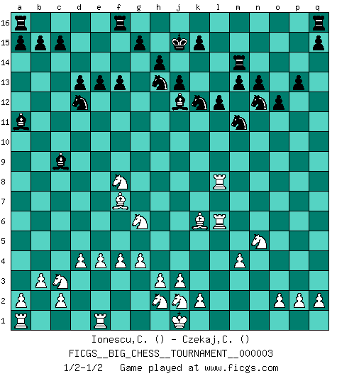 Last move : 1/2-1/2 2007 August 27 12:43:2 [Event "FICGS__BIG_CHESS__TOURNAMENT__000003"] [Site "FICGS"] [Date "2007.03.20"] [Round "1"] [White "Ionescu,Catalin"] [Black "Czekaj,Christophe"] [Result "1/2-1/2"] [WhiteElo ""] [BlackElo ""] 1.g2-g4 j15-h13 2.h1-c6 b16-c14 3.p1-o3 p16-o14 4.d2-d4 m15-m13 5.m2-m4 l16-m15 6.c6-l6 k16-l14 7.l1-p5 g16-f14 8.e2-e4 n15-n13 9.n2-n4 h16-o10 10.j2-h4 e15-e13 11.f1-c4 o16-e7 12.g1-j2 f16-a11 13.h2-f3 d15-d13 14.o1-k5 m15-o13 15.b1-c3 c16-k9 16.k1-h2 k9-j8 17.l6-n6 o13-k9 18.k5-m7 k9-m7 19.n6-m7 j8-n4 20.p5-m8 o10-g10 21.m7-p4 n4-l2 22.m1-l1 l2-e8 23.c1-l9 l14-k12 24.q1-n1 o14-n12 25.f3-e5 p15-p14 26.b2-b3 k12-m11 27.l9-h12 j14-j13 28.h12-f14 h15-f14 29.p4-j10 g10-j10 30.c4-j10 h13-k12 31.j10-f13 j16-j15 32.h4-g6 e7-c9 33.n1-n6 l15-l13 34.f2-f4 f14-h13 35.l1-l8 e8-g10 36.f13-d15 e16-f16 37.g6-f8 g10-j12 38.n6-o6 o15-o13 39.m8-q12 p14-p13 40.q12-k6 o13-o12 41.e5-g6 f15-f13 42.o3-n5 c14-d12 43.d15-a12 l13-l12 44.a12-f7 m16-m14 45.o6-l6 1/2-1/2 Follow this game move after move (download)Every Chess master was once a beginner. (Chernev) Früher wurde jeder komplizierte Zug, jedes interessante Opfer mit großem Beifall und Enthusiasmus aufgenommen. Heute schaltet man einfach seinen Fritz an, und man kann sehen, was los ist, ob der Zug geht oder nicht. (Vladimir Kramnik) Uno por uno, yo los acribillé, mi superioridad muy pronto se volvio aparente. (Jose Capablanca) Mais n'est-ce pas déjà le limiter injurieusement que d'appeler les échecs un jeu? N'est-ce pas aussi une science, un art, ou quelque chose qui, comme le cercueil de Mahomet entre ciel et terre, est suspendu entre l'un et l'autre, et qui réunit un nombre incroyable de contraires ? (Stefan Zweig) To err is human, to shift the blame on someone else is tactical. (Mladen Jankovic)