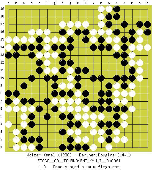 Last move : 1-0 2016 March 11 18:52:46 [Event "FICGS__GO__TOURNAMENT_KYU_I__000061"] [Site "FICGS"] [Date "2016.01.18"] [Round "1"] [Black "Walzer,Karel"] [White "Bartner,Douglas"] [Result "1-0"] [Rating 1 "1230"] [Rating 2 "1441"] 1.d4 q4 2.q17 d16 3.r15 k17 4.k4 r6 5.o3 q2 6.r10 n17 7.d10 m3 8.p4 q5 9.p5 m5 10.o6 m7 11.o8 r8 12.q9 q8 13.o9 k6 14.j5 k2 15.h3 c4 16.c3 c5 17.d5 d6 18.f5 r14 19.q14 r13 20.q13 s15 21.r16 s16 22.s17 s11 23.r11 s12 24.n14 m9 25.c14 f16 26.c7 c6 27.d7 b3 28.c2 b2 29.e6 b7 30.b8 b6 31.c9 j6 32.k10 k8 33.h8 j9 34.h16 h17 35.k16 j16 36.j15 j17 37.l16 l17 38.m10 k5 39.h5 l4 40.j2 k3 41.j4 m16 42.l15 m15 43.m14 n9 44.n10 j10 45.k11 h15 46.h14 g15 47.j14 c1 48.d2 d1 49.e1 b1 50.e2 b15 51.b14 c15 52.d14 f13 53.e12 f14 54.g10 e13 55.d13 f12 56.e11 o15 57.o14 p15 58.q15 s10 59.e15 e16 60.g14 f15 61.h12 r9 62.q10 p8 63.n7 p9 64.p10 j3 65.h1 l9 66.o18 n18 67.o17 o16 68.p16 p14 69.p13 a14 70.a13 a15 71.b13 o19 72.p18 h6 73.g6 h7 74.g8 g7 75.f7 l10 76.l11 j11 77.j12 n2 78.o2 n3 79.l1 m1 80.k1 l2 81.j1 r12 82.q12 f11 83.f10 h9 84.g9 p2 85.m6 l6 86.n6 m8 87.n15 n16 88.j8 j7 89.k9 g11 90.h11 g13 91.h13 d15 92.e14 p3 93.o4 o1 94.q6 q7 95.p6 p7 96.n8 n5 97.l7 k7 98.l8 l5 99.t16 t14 100.p19 n19 101.n4 m4 102.a7 a6 103.a8 a4 104.t17 s14 105.o7 pass 106.pass 1-0 Here are the names of the openings (joseki) played in the four corners : Corner d16 : d16 c14 Hoshi (Hwajeom, Seongjeom, Xingwei`) 4-4 Point. The star or hoshi (4-4) point, emphasizing influence at the potential expense of territory. Ikken Kakari (Hankan Keolch'im, Yi Gua`jiao~, 1-Space Low Approach). Black 2 is the standard approach move to the 4-4. Player Black won this Go (weiqi, baduk) game. Follow this game move after move (download)On the third line, four die, six live. (Anonymous) Life is like a game of cards: the hand you are dealt represents determinism; the way you play it is free will. (Jawaharlal Nehru)