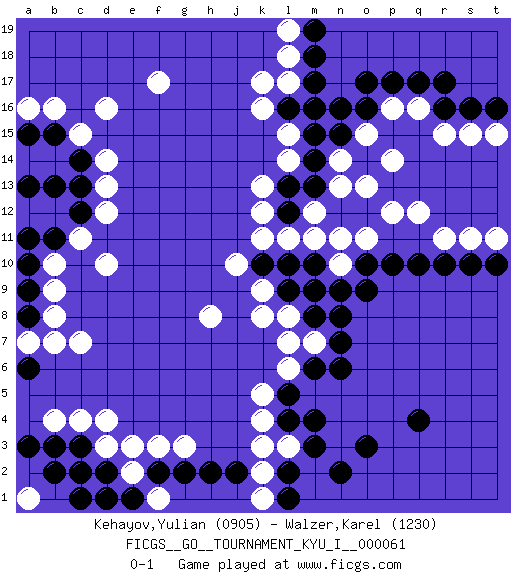 Last move : 0-1 2016 April 19 23:15:38 [Event "FICGS__GO__TOURNAMENT_KYU_I__000061"] [Site "FICGS"] [Date "2016.01.18"] [Round "1"] [Black "Kehayov,Yulian"] [White "Walzer,Karel"] [Result "0-1"] [Rating 1 "0905"] [Rating 2 "1230"] 1.r16 d4 2.q4 d16 3.o17 d10 4.q10 k17 5.o3 k4 6.k10 q16 7.q17 p16 8.p17 r15 9.r17 q12 10.c14 c15 11.c12 c11 12.b15 b16 13.a15 a16 14.b13 d12 15.b11 b10 16.a11 d14 17.a13 f17 18.m4 h8 19.n8 r11 20.r10 o11 21.s10 k11 22.l10 l11 23.m10 m11 24.o10 f3 25.n16 l15 26.n15 p14 27.m14 l14 28.m13 n10 29.n9 n11 30.p10 p12 31.l13 k13 32.l12 k12 33.m17 l8 34.m9 j10 35.o9 l3 36.m3 l6 37.m6 c7 38.a10 b9 39.a9 b8 40.a8 a7 41.c3 d3 42.c2 c4 43.b3 b4 44.d2 e2 45.a3 b1 46.d1 m7 47.n6 k9 48.n7 s11 49.l5 k5 50.l4 k3 51.l2 k2 52.l1 k1 53.n2 l18 54.m18 s15 55.s16 l17 56.m16 n14 57.o14 n13 58.m15 o15 59.o16 o13 60.t10 t11 61.t16 t15 62.a1 a2 63.b2 a1 64.c13 d13 65.m19 l19 66.l9 k8 67.m8 l7 68.l16 k16 69.c1 a1 70.a6 b7 71.e1 m12 72.f2 e3 73.g2 g3 74.h2 f1 75.j2 pass 0-1 Here are the names of the openings (joseki) played in the four corners : Corner d16 : d16 c14 Hoshi (Hwajeom, Seongjeom, Xingwei`) 4-4 Point. The star or hoshi (4-4) point, emphasizing influence at the potential expense of territory. Ikken Kakari (Hankan Keolch'im, Yi Gua`jiao~, 1-Space Low Approach). Black 2 is the standard approach move to the 4-4. Player White won this Go (weiqi, baduk) game. Follow this game move after move (download)Always remember, keep the balance. [between territory and influence] (Figaro) The problem with manipulation is that people can turn on you. (Horatio Caine, C.S.I. Miami)