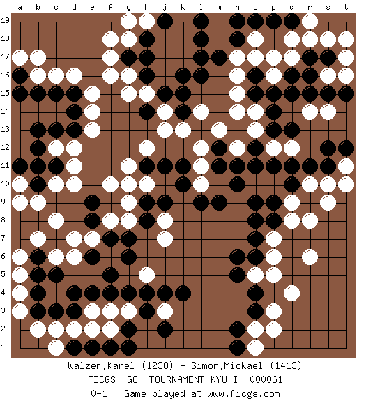 Last move : 0-1 2016 July 24 22:22:15 [Event "FICGS__GO__TOURNAMENT_KYU_I__000061"] [Site "FICGS"] [Date "2016.01.18"] [Round "1"] [Black "Walzer,Karel"] [White "Simon,Mickael"] [Result "0-1"] [Rating 1 "1230"] [Rating 2 "1413"] 1.d4 q4 2.q16 d16 3.o3 r6 4.k4 c6 5.c5 d6 6.f4 d10 7.q10 o17 8.o16 n16 9.o15 q17 10.r17 p17 11.q15 n15 12.h16 r18 13.s17 p3 14.o4 f6 15.l17 h5 16.h4 f17 17.g17 g18 18.h18 g16 19.h17 f16 20.n18 n17 21.m17 n14 22.p13 s18 23.k10 h15 24.j15 j14 25.h14 g15 26.k14 j13 27.k16 k13 28.d13 r10 29.r11 q9 30.r9 s10 31.s11 s9 32.p9 q8 33.p8 r8 34.p11 h10 35.c15 c16 36.c11 c10 37.b13 c12 38.b12 d11 39.b11 d12 40.b15 b16 41.b10 b9 42.c13 j3 43.j4 g3 44.g4 e3 45.e4 f3 46.h3 c2 47.g2 f2 48.j2 t11 49.t12 t10 50.s12 q12 51.q11 o10 52.d3 d2 53.f1 e2 54.b3 b2 55.c3 a3 56.b6 b7 57.g1 a5 58.b5 a6 59.c7 d7 60.e9 j8 61.f7 f8 62.g7 g8 63.g6 p7 64.j9 j7 65.e8 e7 66.h9 f10 67.h8 g10 68.f5 c8 69.o7 p6 70.o6 o5 71.n5 p5 72.n6 p10 73.o8 l10 74.l9 l11 75.k11 l12 76.m9 s16 77.r16 t17 78.s15 t16 79.n11 o11 80.o12 l14 81.k15 o14 82.p14 n12 83.n10 o13 84.o9 p16 85.p15 p12 86.o11 r14 87.q13 s14 88.t15 t18 89.r15 e13 90.d14 e14 91.a16 o2 92.n2 a17 93.a15 b17 94.d15 p2 95.n1 o1 96.q19 o18 97.o19 m18 98.n19 m19 99.p19 r19 100.l18 q18 101.l19 f18 102.m12 m13 103.m11 e15 104.h11 h12 105.j11 g11 106.e6 h19 107.j19 g19 108.l16 g9 109.b4 a4 110.e1 a10 111.a11 a9 112.d1 c1 0-1 Here are the names of the openings (joseki) played in the four corners : Corner q4 : q4 o3 Hoshi (Hwajeom, Seongjeom, Xingwei`) 4-4 Point. The star or hoshi (4-4) point, emphasizing influence at the potential expense of territory. Ikken Kakari (Hankan Keolch'im, Yi Gua`jiao~, 1-Space Low Approach). Black 2 is the standard approach move to the 4-4. Corner d4 : d4 c6 Hoshi (Hwajeom, Seongjeom, Xingwei`) 4-4 Point. The star or hoshi (4-4) point, emphasizing influence at the potential expense of territory. Ikken Kakari (Hankan Keolch'im, Yi Gua`jiao~, 1-Space Low Approach). White 2 is the standard approach move to the 4-4. Corner q16 : q16 o17 Hoshi (Hwajeom, Seongjeom, Xingwei`) 4-4 Point. The star or hoshi (4-4) point, emphasizing influence at the potential expense of territory. Ikken Kakari (Hankan Keolch'im, Yi Gua`jiao~, 1-Space Low Approach). White 2 is the standard approach move to the 4-4. Corner d16 : d16 h16 Hoshi (Hwajeom, Seongjeom, Xingwei`) 4-4 Point. The star or hoshi (4-4) point, emphasizing influence at the potential expense of territory. Player White won this Go (weiqi, baduk) game. Follow this game move after move (download)Add one stone, then sacrifice both. (Anonymous) The next best thing to gambling and winning is gambling and loosing. (Nick Dandalos)