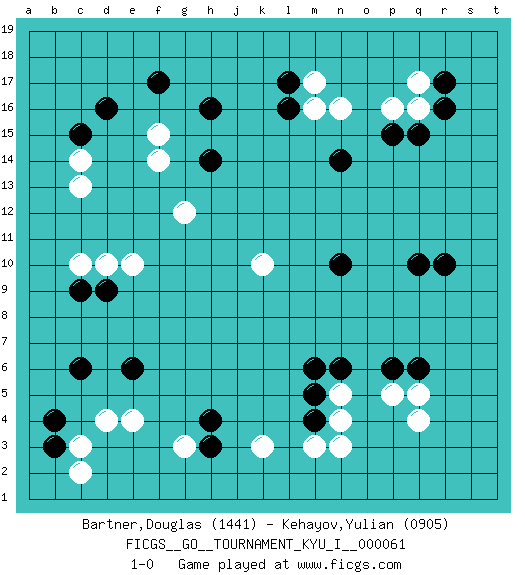 Last move : 1-0 2016 March 28 8:25:14 [Event "FICGS__GO__TOURNAMENT_KYU_I__000061 "] [Site "FICGS"] [Date "2016.01.18"] [Round "1"] [Black "Bartner,Douglas "] [White "Kehayov,Yulian "] [Result "1-0"] [Rating 1 "1441"] [Rating 2 "0905"] 1.r16 d4 2.d16 q4 3.l17 k3 4.q10 d10 5.q6 p5 6.p6 q5 7.n6 n5 8.m5 n4 9.m4 m3 10.m6 n3 11.n10 c13 12.f17 k10 13.c6 q17 14.r17 q16 15.q15 p16 16.p15 n16 17.n14 m17 18.l16 m16 19.e6 e4 20.b4 c3 21.b3 c2 22.c9 c10 23.d9 e10 24.c15 c14 25.r10 f14 26.h16 f15 27.h14 g12 28.h4 g3 29.h3 1-0 This go game has been lost on time (started : 2016.01.18 20:50:23) Here are the names of the openings (joseki) played in the four corners : Corner q4 : q4 q6Hoshi (Hwajeom, Seongjeom, Xingwei`) 4-4 Point. The star or hoshi (4-4) point, emphasizing influence at the potential expense of territory.Ikken Takagakari (Hankan Nop'dakeolch'im, Yi Gaojia, 1-Space High Approach). White typically responds at 6-4 or 3-10. White 4-10 is played when White finds play on the right side advantageous. White 4-8 or 3-8 may be played when White has support at top. Corner d16 : d16 c13Hoshi (Hwajeom, Seongjeom, Xingwei`) 4-4 Point. The star or hoshi (4-4) point, emphasizing influence at the potential expense of territory.Niken Kakari (Dukan Keolch'im, E`r Gua`jiao~, 2-Space Low Approach). Black typically answers by 7-3 or 3-5 (which is not joseki). Corner d4 : d4 c6Hoshi (Hwajeom, Seongjeom, Xingwei`) 4-4 Point. The star or hoshi (4-4) point, emphasizing influence at the potential expense of territory.Ikken Kakari (Hankan Keolch'im, Yi Gua`jiao~, 1-Space Low Approach). Black 2 is the standard approach move to the 4-4. Player Black won this Go (weiqi, baduk) game.Follow this game move after move (download ) Don't count territory held by only one eye. (Anonymous) Men never do evil so completely and cheerfully as when they do it from religious conviction. (Blaise Pascal)