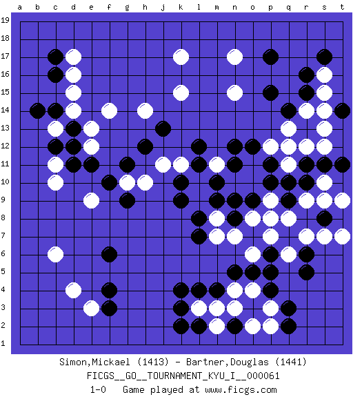 Last move : 1-0 2016 April 11 22:1:45 [Event "FICGS__GO__TOURNAMENT_KYU_I__000061"] [Site "FICGS"] [Date "2016.01.18"] [Round "1"] [Black "Simon,Mickael"] [White "Bartner,Douglas"] [Result "1-0"] [Rating 1 "1413"] [Rating 2 "1441"] 1.r16 d16 2.q3 d4 3.p17 k17 4.r10 n17 5.f3 e3 6.f4 c6 7.k3 c11 8.c17 d17 9.c16 d15 10.b14 k15 11.r5 r14 12.p15 r12 13.p10 p12 14.n11 s16 15.s17 s15 16.r15 s13 17.f6 k11 18.d13 c13 19.c14 d14 20.c12 e13 21.d12 e12 22.d11 c10 23.e11 f14 24.k9 l3 25.l4 m3 26.k4 p3 27.p4 p2 28.q2 o4 29.o5 n4 30.n5 e9 31.n2 o2 32.m4 n3 33.l2 m2 34.k2 l9 35.k10 l10 36.l11 m11 37.l12 n10 38.n12 o10 39.p11 p9 40.q9 p8 41.n8 q8 42.r8 r7 43.s8 q6 44.p5 m8 45.l8 s7 46.l7 o11 47.o12 q11 48.q10 s10 49.r11 q12 50.s11 s9 51.o9 o8 52.n9 n7 53.m10 r9 54.t8 t7 55.o7 p7 56.p6 o6 57.r6 t9 58.s8 s12 59.t11 n15 60.q14 q13 61.t14 s14 62.g11 j11 63.j13 h14 64.h12 h10 65.g9 g10 66.f10 m7 67.m9 1-0 Here are the names of the openings (joseki) played in the four corners : Corner d4 : d4 f3 Hoshi (Hwajeom, Seongjeom, Xingwei`) 4-4 Point. The star or hoshi (4-4) point, emphasizing influence at the potential expense of territory. Ikken Kakari (Hankan Keolch'im, Yi Gua`jiao~, 1-Space Low Approach). Black 2 is the standard approach move to the 4-4. Player Black won this Go (weiqi, baduk) game. Follow this game move after move (download)It is difficult to know exactly what you are doing. (Pierre Audouard) I've never seen so many men wasted so badly. (Blondie in The Good, The Bad and The Ugly)