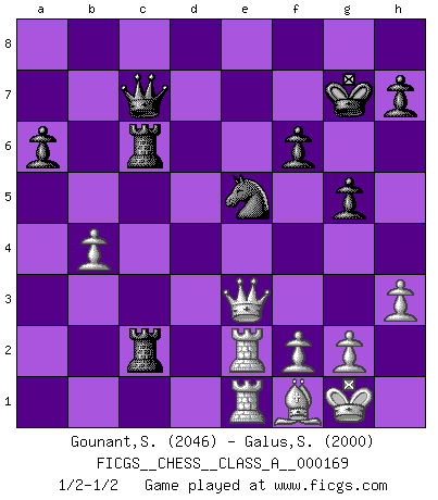 Last move : 1/2-1/2 2016 July 22 14:18:18 [Event "FICGS__CHESS__CLASS_A__000169"] [Site "FICGS"] [Date "2016.01.20"] [Round "1"] [White "Gounant,Stanislas"] [Black "Galus,Stanislaw"] [Result "1/2-1/2"] [WhiteElo "2046"] [BlackElo "2000"] 1.d4 Nf6 2.Nf3 g6 3.Nc3 d5 4.Bf4 Bg7 5.e3 O-O 6.Be2 c5 7.Ne5 Nc6 8.O-O cxd4 9.exd4 Qb6 10.Nxc6 Qxc6 11.Bb5 Qb6 12.a4 a6 13.a5 Qd8 14.Be2 Bd7 15.Qd2 Rc8 16.Rfe1 Bc6 17.Na4 Ne4 18.Qb4 Bxa4 19.Rxa4 e5 20.dxe5 Re8 21.R4a1 Bxe5 22.Bxe5 Rxe5 23.Qd4 Re6 24.c3 Rd6 25.Bf1 Nc5 26.Ra3 Ne6 27.Qd3 R8c6 28.Qf3 b6 29.axb6 Rxb6 30.Ra2 Kg7 31.Rd1 d4 32.Bc4 Ng5 33.Qg3 dxc3 34.Qxc3+ f6 35.Re1 Nf7 36.Bf1 Rdc6 37.Qa3 Ne5 38.b4 Qc7 39.Rae2 Rc3 40.Qb2 Rbc6 41.h3 Rc1 42.Qa3 g5 43.Qe3 R1c3 44.Qd2 Rc2 45.Qe3 1/2-1/2 King's Indian : East Indian defense Kingside Castling by player Black (move 5) Kingside Castling by player White (move 8) This chess game ended in a draw. Follow this game move after move (download)Discovered check is the dive bomber of the Chessboard. (Reuben Fine) Meine Liebe ist Schach, Schach, Schach. Ich muss jeden Tag Schach spielen, deshalb fühle ich mich so stark. (Miguel Najdorf) Sin errores no puede haber brillantez. (Emanuel Lasker) Vous savez, camarade Pachman, je n'éprouve pas de plaisir à être ministre, je jouerais plutôt aux échecs comme vous, ou alors ferais une révolution au Venezuela. (Che Guevara à Ludek Pachman, 'Checkmate in Prague', 1975) I'm extremely disappointed. I send you out for exciting, new designer drugs, you come back with tomato sauce. (Gregory House, House M.D.)