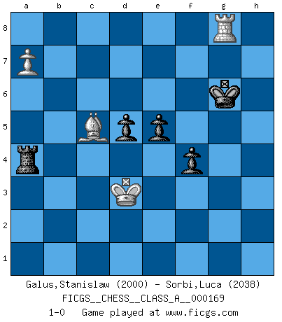 Last move : 1-0 2016 May 27 5:45:4 [Event "FICGS__CHESS__CLASS_A__000169"] [Site "FICGS"] [Date "2016.01.20"] [Round "1"] [White "Galus,Stanislaw"] [Black "Sorbi,Luca"] [Result "1-0"] [WhiteElo "2000"] [BlackElo "2038"] 1.d4 Nf6 2.c4 e6 3.Nf3 d5 4.Nc3 c6 5.Bg5 h6 6.Bh4 dxc4 7.e4 g5 8.Bg3 b5 9.Be2 Bb7 10.h4 b4 11.hxg5 bxc3 12.bxc3 Nxe4 13.Be5 Nxc3 14.Qc2 Nxe2 15.Kxe2 Rg8 16.gxh6 Bxh6 17.Rab1 Ba6 18.Rxh6 c3 19.Ke3 Nd7 20.Qh7 Rxg2 21.Qe4 Rc8 22.Rh8+ Nf8 23.Qf4 f5 24.Bd6 Qf6 25.Rxf8+ Qxf8 26.Bxf8 Rg4 27.Bc5 Rxf4 28.Kxf4 c2 29.Rc1 Be2 30.Rxc2 Bxf3 31.Kxf3 a5 32.Rb2 Kf7 33.Rb7+ Kg6 34.a4 Rh8 35.Ra7 Rh3+ 36.Ke2 Rc3 37.Rxa5 Rc2+ 38.Kd3 Rxf2 39.Ra8 Ra2 40.a5 f4 41.d5 cxd5 42.a6 e5 43.a7 Ra4 44.Rg8+ 1-0 Queen's pawn game 10 pieces endgame at move 38 : White KRBPP , Black KRPPP WHITE : King + 1 Rook 1 Bishop 2 Pawns BLACK : King + 1 Rook 3 Pawns 9 pieces endgame at move 41 : White KRBP , Black KRPPP WHITE : King + 1 Rook 1 Bishop 1 Pawn BLACK : King + 1 Rook 3 Pawns Player White won this chess game. Follow this game move after move (download)Adequate compensation for a sacrifice is having a sound combination leading to a winning position; adequate compensation for a blunder is having your opponent snatch defeat from the jaws of victory. (Bruce A. Moon) Ich kenne keine einzige Person, die behaupten würde, Garri Kasparow sei ein guter Mensch (Nigel Short) Hay jugadores fuertes y personas amables y yo soy un jugador fuerte. (Bobby Fischer) Le jeu d'échecs est comme rejeté hors du temps. (Antoine de Saint-Exupéry) Creativity is allowing yourself to make mistakes. Art is knowing which ones to keep. (Scott Adams)