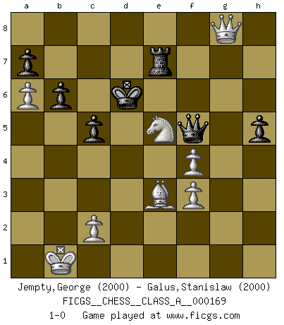 Last move : 1-0 2016 September 23 8:28:16 [Event "FICGS__CHESS__CLASS_A__000169"] [Site "FICGS"] [Date "2016.01.20"] [Round "1"] [White "Jempty,George"] [Black "Galus,Stanislaw"] [Result "1-0"] [WhiteElo "2000"] [BlackElo "2000"] 1.e4 e6 2.d4 d5 3.Nc3 Bb4 4.exd5 exd5 5.Bd3 Nc6 6.a3 Bxc3+ 7.bxc3 Nge7 8.Qf3 Be6 9.Ne2 Qd7 10.O-O O-O-O 11.h3 Ng6 12.a4 f6 13.a5 Nh4 14.Qh5 g5 15.Ng3 h6 16.a6 b6 17.Bb5 Rdg8 18.f4 f5 19.Rf2 Kb8 20.Ba3 Ng6 21.Ne2 Nh4 22.Nc1 Bf7 23.Qe2 Be8 24.Nd3 Qc8 25.Qf1 g4 26.hxg4 fxg4 27.Re1 g3 28.Rd2 Nxd4 29.Rxe8 Ndf3+ 30.gxf3 Rxe8 31.Bxe8 g2 32.Rxg2 Nxg2 33.Bf7 Qf5 34.Qxg2 Qxf7 35.Kf2 Rg8 36.Qh2 Qg6 37.Bc1 h5 38.Be3 Qf5 39.Ke1 Kc8 40.Kd2 c6 41.Ne5 Kc7 42.Kc1 Kd6 43.c4 dxc4 44.Nxc4+ Kd5 45.Qe2 Re8 46.Kb1 Re7 47.Ne5 Kd6 48.Qc4 c5 49.Qg8 1-0 French : Winawer (Nimzovich) variation Kingside Castling by player White (move 10) Queenside Castling by player Black (move 10) Player White won this chess game. Follow this game move after move (download)Blessed be the memory of him who gave the world this immortal game. (A. G. Gardiner) Es ist nicht das erste mal, dass sich die FIDE dem Arabischen Geld gebeugt hat (über die FIDE WM 2004 in Lybien). (Larry Evans) Por la belleza de sus partidas, la claridad de su juego y lo brillante de sus ideas, Fischer se creó el mismo como un artista de la misma estatura como Brahms, Rembrandt y Shakespeare. (David Levy) RxDa4 pat (...) The man who strikes first admits that his ideas have given out. (Chinese proverb)
