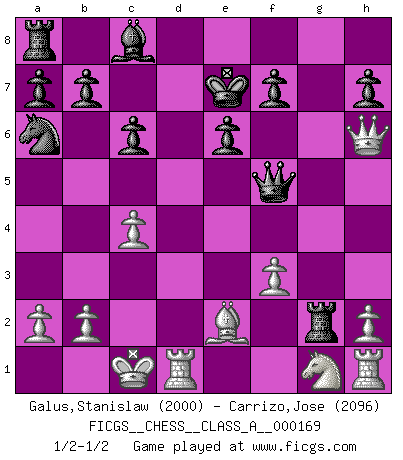 Last move : 1/2-1/2 2016 February 1 21:32:44 [Event "FICGS__CHESS__CLASS_A__000169"] [Site "FICGS"] [Date "2016.01.20"] [Round "1"] [White "Galus,Stanislaw"] [Black "Carrizo,Jose"] [Result "1/2-1/2"] [WhiteElo "2000"] [BlackElo "2096"] 1.d4 d5 2.c4 e6 3.Nc3 c6 4.e4 dxe4 5.Nxe4 Bb4+ 6.Bd2 Qxd4 7.Bxb4 Qxe4+ 8.Be2 Na6 9.Bc3 Ne7 10.Bxg7 Rg8 11.Bf6 Rg6 12.f3 Qf5 13.Bxe7 Kxe7 14.Qd2 Rxg2 15.O-O-O Kf8 16.Qh6+ Ke7 17.Qd2 Kf8 18.Qh6+ Ke7 1/2-1/2 QGD : Semi-Slav, Marshall gambit Queenside Castling by player White (move 15) This chess game ended in a draw. Follow this game move after move (download)There is only one thing Fischer does in Chess without pleasure: to lose ! (Boris Spassky) Der Partner hat auch seine Existenzberechtigung. (Savielly Grigorievitsch Tartakower) El Peón aislado arroja penumbra sobre todo el tablero. (Aaron Nimzovich) Même un GMI sait rarement calculer sur plus de cinq coups une attaque à sacrifices. (Rudolf Spielmann) Everything in life is luck. (Donald Trump)