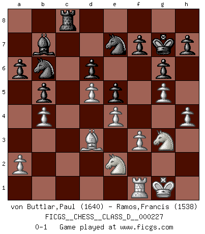 Last move : 0-1 2016 July 11 1:11:20 [Event "FICGS__CHESS__CLASS_D__000227"] [Site "FICGS"] [Date "2016.01.22"] [Round "1"] [White "von Buttlar,Paul"] [Black "Ramos,Francis"] [Result "0-1"] [WhiteElo "1640"] [BlackElo "1538"] 1.c4 Nf6 2.Nc3 g6 3.e4 d6 4.d4 Bg7 5.f3 O-O 6.Be3 e5 7.d5 c6 8.Bd3 b5 9.Nge2 cxd5 10.cxd5 a6 11.O-O Nh5 12.g4 Nf6 13.Ng3 Nbd7 14.Qd2 Nb6 15.b3 Bb7 16.Rac1 Rc8 17.Nce2 Nbd7 18.Bh6 Nc5 19.Bb1 Qe7 20.Bxg7 Kxg7 21.Qg5 Kh8 22.b4 Ncd7 23.h4 Ng8 24.Qxe7 Nxe7 25.g5 Nb6 26.Bd3 Kg7 27.Rxc8 Rxc8 0-1 This chess game has been lost on time (started : 2016.01.22 17:11:3) English Opening Kingside Castling by player Black (move 5) Kingside Castling by player White (move 11) Player Black won this chess game. Follow this game move after move (download)When you absolutely don't know what to do anymore, it is time to panic. (John van der Wiel) Später, ... hatte ich zunehmend Erfolg in entscheidenden Partien. Vielleicht weil ich eine einfache Wahrheit erkannte: nicht nur ich hatte Angst, auch mein Gegner. (Mikhail Nekhemyevich Tal) El Ajedrez se juega con la mente... ¡no con las manos!. (Renaud y Kahn) Si le désir cupide (et stupide) de gagner est une inépuisable source de souffrance, une combinaison brillante sur l'échiquier est une découverte : le coquelicot qui s'épanouit lorsque apparaît la Voie Lactée. (Arrabal) The project of the man are lower than those of the sky. (Chinese proverb)