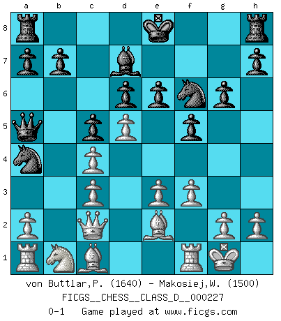 Last move : 0-1 2016 July 26 16:4:52 [Event "FICGS__CHESS__CLASS_D__000227"] [Site "FICGS"] [Date "2016.01.22"] [Round "1"] [White "von Buttlar,Paul"] [Black "Makosiej,Wladyslaw"] [Result "0-1"] [WhiteElo "1640"] [BlackElo "1500"] 1.c4 g6 2.Nc3 Bg7 3.d4 c5 4.d5 Bxc3+ 5.bxc3 Qa5 6.Qc2 f5 7.e3 d6 8.Nf3 Nd7 9.Be2 Ngf6 10.O-O Nb6 11.Nd2 Bd7 12.f3 Na4 13.Nb1 e6 0-1 This chess game has been lost on time (started : 2016.01.22 17:11:3) English Opening Kingside Castling by player White (move 10) Player Black won this chess game. Follow this game move after move (download)Chess is a matter of delicate judgment, knowing when to punch and how to duck. (Bobby Fischer) Man kann eine Schachpartie nur gewinnen, wenn das Gleichgewicht gestört ist. In einer Stellung mit ungestörtem Gleichgewicht ist auch das größte Genie hilflos - in der Stellung steckt dann eben kein genialer Einfall. (Wilhelm Steinitz) A la fecha, Fischer esta simplemente un nivel arriba de todos los mejores jugadores de Ajedrez del mundo. (John Jacobs) J'apprécie les joueurs d'est-indienne, c'est grâce à eux que je nourris ma famille depuis tant d'années. (Petrosian) A belief is an idea the mind possesses, an idea that possesses the mind. (Robert Oxden Bolton)