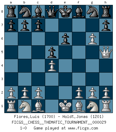 Last move : 1-0 2007 May 10 20:34:23 [Event "FICGS__CHESS__THEMATIC_TOURNAMENT__000029"] [Site "FICGS"] [Date "2007.03.20"] [Round "1"] [White "Flores,Luis"] [Black "Holdt,Jonas"] [Result "1-0"] [WhiteElo "1700"] [BlackElo "1201"] 1.e4 e6 2.d4 f5 3.exf5 d5 4.Qh5+ g6 5.fxg6 1-0 This chess game has been lost on time (started : 2007.03.20 14:50:51) French defense Player White won this chess game. Follow this game move after move (download)A bad day of Chess is better than any good day at work. (Anonymous) Ihnen, Herr Lasker, habe ich nur drei Worte zu sagen: Schach und matt. (Siegbert Tarrasch) El Ajedrez es el arte del análisis. (Mikhail Botvinnik) Pour se monter efficace, un Cavalier a besoin d'avant-postes ! Les Cavaliers font les meilleurs bloqueurs de pions passés. When a man with money meets a man with experience, the man with experience leaves with money and the man with money leaves with experience. (Anonymous)