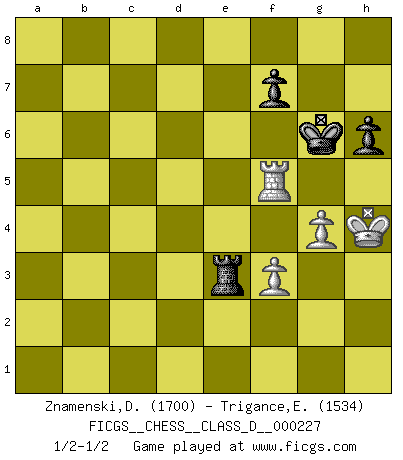 Last move : 1/2-1/2 2016 February 8 9:26:26 [Event "FICGS__CHESS__CLASS_D__000227"] [Site "FICGS"] [Date "2016.01.22"] [Round "1"] [White "Znamenski,Dimitri"] [Black "Trigance,Emile"] [Result "1/2-1/2"] [WhiteElo "1700"] [BlackElo "1534"] 1.e4 c6 2.d4 d5 3.Nc3 dxe4 4.Nxe4 Nd7 5.Nf3 Ngf6 6.Nxf6+ Nxf6 7.Be2 Bg4 8.O-O g6 9.h3 Bxf3 10.Bxf3 Bg7 11.a4 a5 12.c3 O-O 13.Be3 Nd5 14.Bxd5 Qxd5 15.b4 axb4 16.cxb4 b6 17.Qd3 c5 18.Qb5 Qd6 19.dxc5 bxc5 20.Rad1 Qe6 21.Bxc5 Rfb8 22.Qd7 Qxd7 23.Rxd7 Rxa4 24.Bxe7 Bf8 25.Bxf8 Kxf8 26.Rb1 Raxb4 27.Rxb4 Rxb4 28.g4 g5 29.Kg2 h6 30.Kg3 Rb3+ 31.f3 Kg7 32.Rd5 Kg6 33.Rf5 Re3 34.h4 gxh4+ 35.Kxh4 1/2-1/2 Caro-Kann : Steinitz variation Kingside Castling by player White (move 8) Kingside Castling by player Black (move 12) 10 pieces endgame at move 27 : White KRPPP , Black KRPPP WHITE : King + 1 Rook 3 Pawns BLACK : King + 1 Rook 3 Pawns 9 pieces endgame at move 34 : White KRPP , Black KRPPP WHITE : King + 1 Rook 2 Pawns BLACK : King + 1 Rook 3 Pawns 8 pieces endgame at move 35 : White KRPP , Black KRPP WHITE : King + 1 Rook 2 Pawns BLACK : King + 1 Rook 2 Pawns This chess game ended in a draw. Follow this game move after move (download)What would Chess be without silly mistakes ? (Kurt Richter) Ich brauche nur einen Blick auf das Schachbrett zu werfen, und weiß schon, was in der Stellung steckt, was geschehen kann und was geschehen wird. Alle übrigen suchen und prüfen, ich aber weiß es! (José Raúl Capablanca) El jugador de combinación piensa hacia adelante; comienza de la posición dada y trabaja las movidas contundentes en su mente. (Emanuel Lasker) Le jeu d'échecs est comme rejeté hors du temps. (Antoine de Saint-Exupéry) Philosophers use a language that is already deformed as though by shoes that are too tight. (Ludwig Wittgenstein)