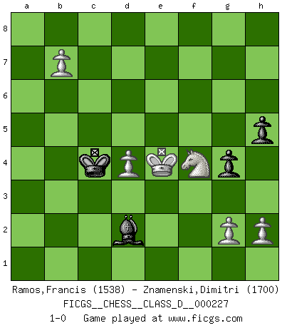 Last move : 1-0 2016 February 8 16:57:32 [Event "FICGS__CHESS__CLASS_D__000227"] [Site "FICGS"] [Date "2016.01.22"] [Round "1"] [White "Ramos,Francis"] [Black "Znamenski,Dimitri"] [Result "1-0"] [WhiteElo "1538"] [BlackElo "1700"] 1.e4 e5 2.Nf3 Nc6 3.Bb5 a6 4.Ba4 Nf6 5.O-O Be7 6.Re1 b5 7.Bb3 O-O 8.c3 d5 9.exd5 Nxd5 10.Nxe5 Nxe5 11.Rxe5 Bb7 12.d4 h6 13.Re1 Re8 14.Be3 Bg5 15.Qd3 Nxe3 16.fxe3 c5 17.Bc2 cxd4 18.Qh7+ Kf8 19.Qh8+ Ke7 20.exd4 Kd7 21.Bf5+ Kc7 22.Qxe8 Qxe8 23.Rxe8 Rxe8 24.Kf1 g6 25.Bh3 Kd6 26.Na3 Bc8 27.Bxc8 Rxc8 28.Nc2 a5 29.Ke2 f5 30.Kd3 Kd5 31.Re1 Rc6 32.Re5+ Kd6 33.Rxb5 a4 34.c4 Bc1 35.b3 axb3 36.axb3 f4 37.b4 g5 38.Rf5 g4 39.Rf6+ Kd7 40.Rxc6 Kxc6 41.Ke4 h5 42.b5+ Kb6 43.Ne1 Ka5 44.Nd3 Bd2 45.Nxf4 Kb4 46.b6 Kxc4 47.b7 1-0 Ruy Lopez : Closed, 7...O-O Kingside Castling by player White (move 5) Kingside Castling by player Black (move 7) 10 pieces endgame at move 46 : White KNPPPP , Black KBPP WHITE : King + 1 Knight 4 Pawns BLACK : King + 1 Bishop 2 Pawns Player White won this chess game. Follow this game move after move (download)I give 98 percent of my mental energy to Chess. Others give only 2 percent. (Bobby Fischer) Wie bekannt hörte Morphy 1859 auf, Schach zu spielen. Seine Enttäuschung galt nicht so sehr dem Schach, wie den Schachspielern. (Robert James Fischer) La pasion por jugar al Ajedrez es una de las mas inexplicables en el mundo. (H.G. Wells) On peut tirer plus d'utilité d'une partie perdue que de 100 parties gagnées. (Capablanca) If only faces could talk... (Pat Summerall, Sportscaster during the Super Bowl)